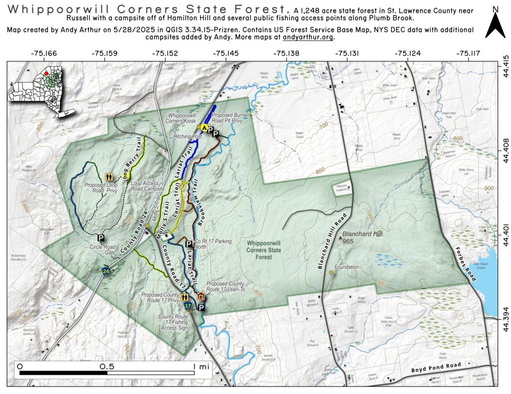 The highest elevation is a U.S. National Geodetic Survey benchmark known as Slawson atop an unnamed hill in the Town of Sanford. It is approximately 2087 feet[2] (636 m) above sea level. An area due east on the Delaware County line in Oquaga Creek State Park also lies within the same elevation contour line. The lowest point is 864 feet (263 m) above sea level, along the Susquehanna at the Pennsylvania state line.