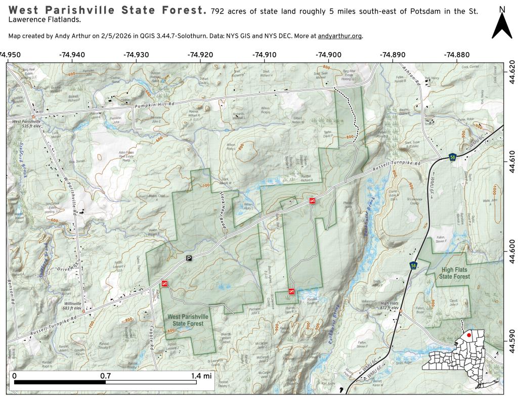 Piseco-Powley Road is an approximately 17-mile unpaved route through the Ferris Lake Wild Forest. It offers a remote, primitive experience with no cell service and limited amenities.