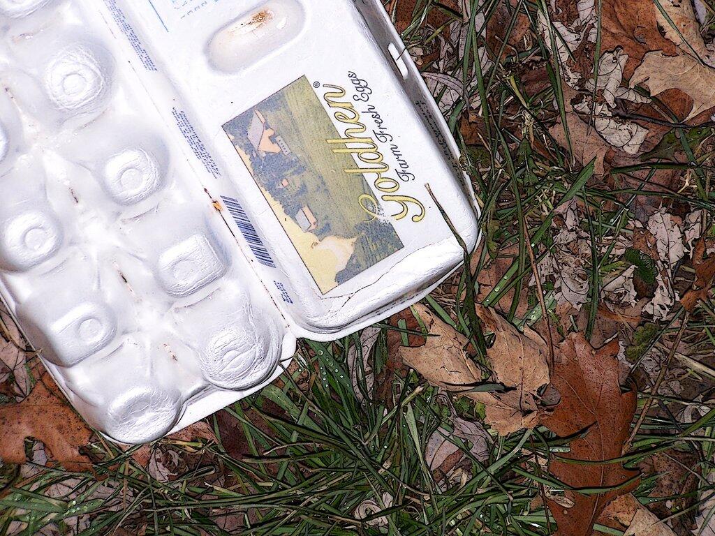 A picture of a styrofoam egg carton that blew away from the barn. We reuse old egg cartons at our farm for the sale of eggs, as new egg cartons are expensive, and a waste of resources to keep sending them to the landfill.