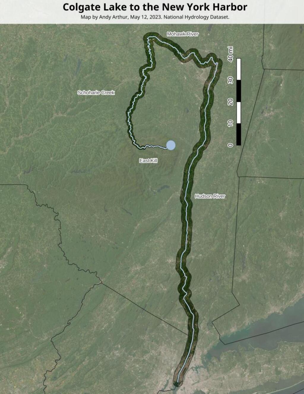 The highest point is Slide Mountain, at approximately 4,180 feet (1,270 m) above sea level. The lowest point is sea level along the Hudson River.