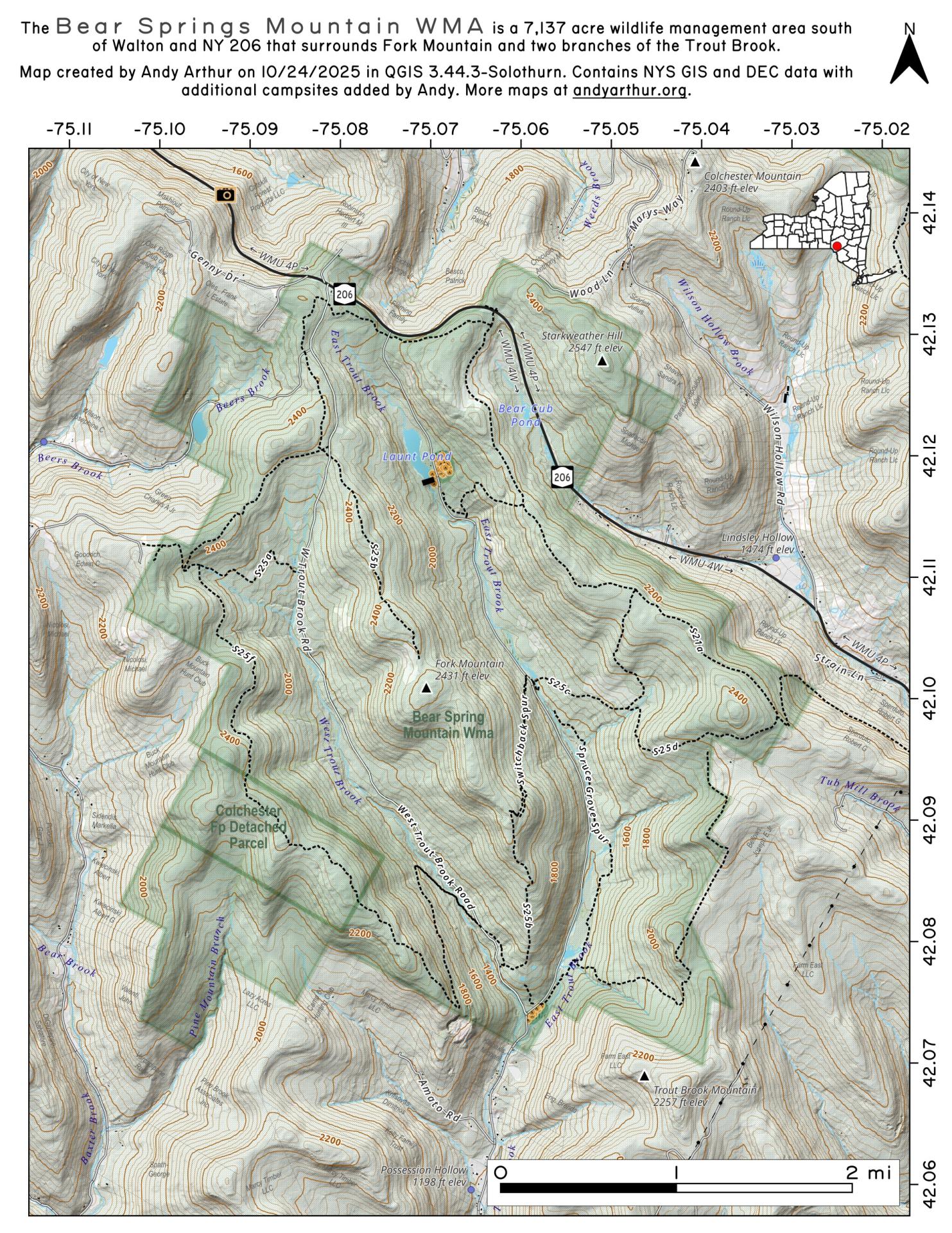 Bear Spring Mountain Wildlife Management Area (WMA) consists of over 7,000 acres of upland habitat in Delaware County acquired by the State in 1961. It is located in the Towns of Colchester and Walton along Route 206. East Trout Brook Rd and West Trout Brook Rd run through the heart of the property from Rt 206 and join at the southern end of the property. Parking areas providing access can be found along each of these roads.