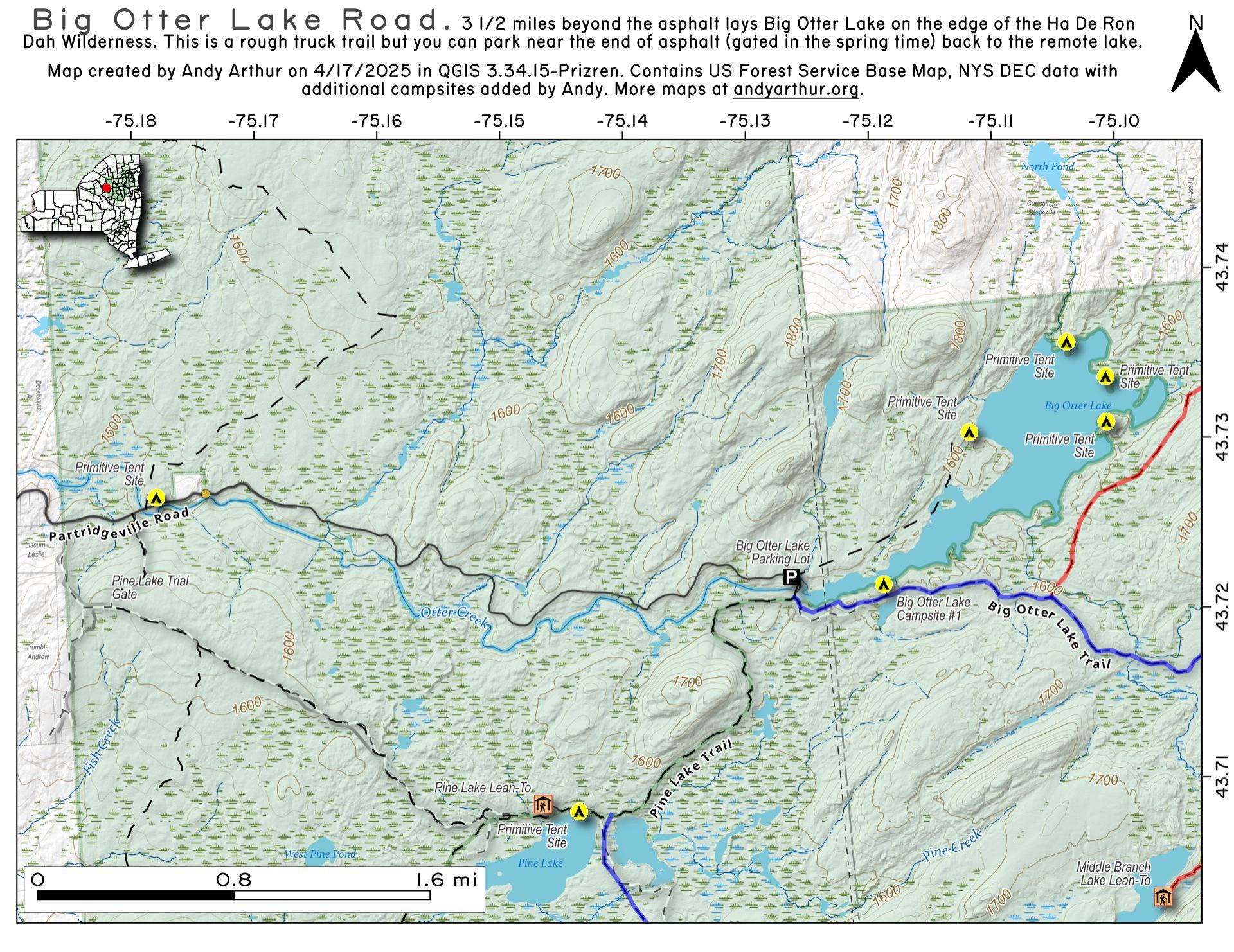 ... shows your location as a blue dot in relationship to campsites, trails, state land. This online map requires cell service, won't work in remote country, so also bring a paper map.