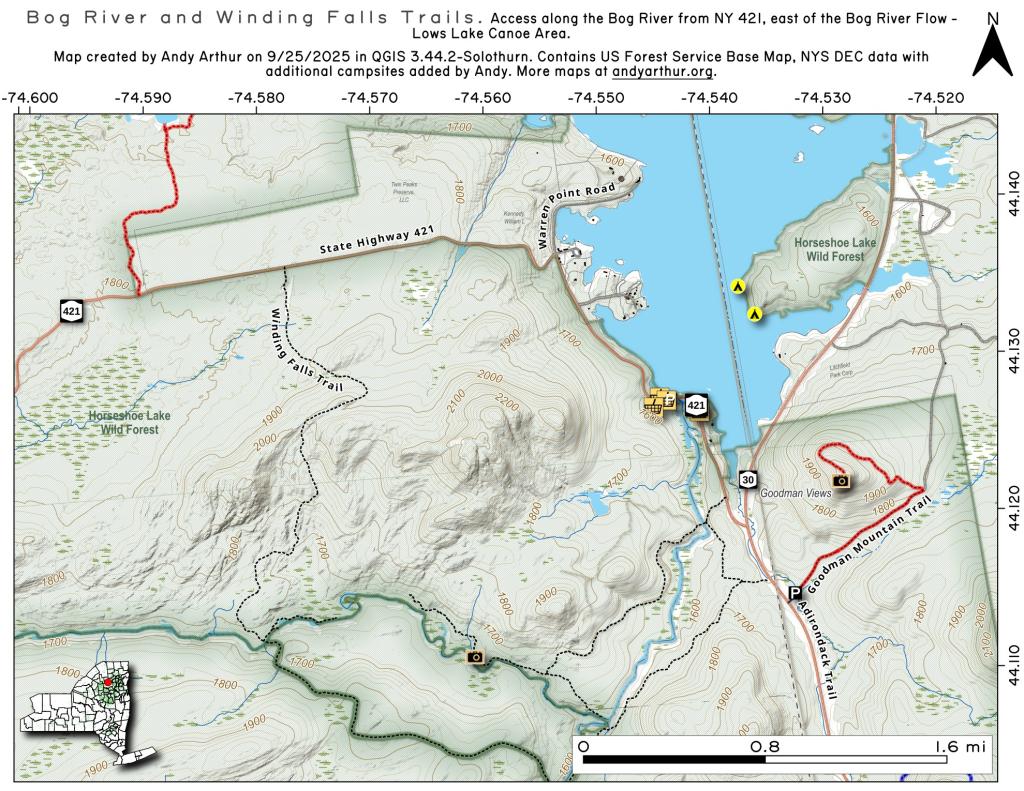 ... shows your location as a blue dot in relationship to campsites, trails, state land. This online map requires cell service, won't work in remote country, so also bring a paper map.