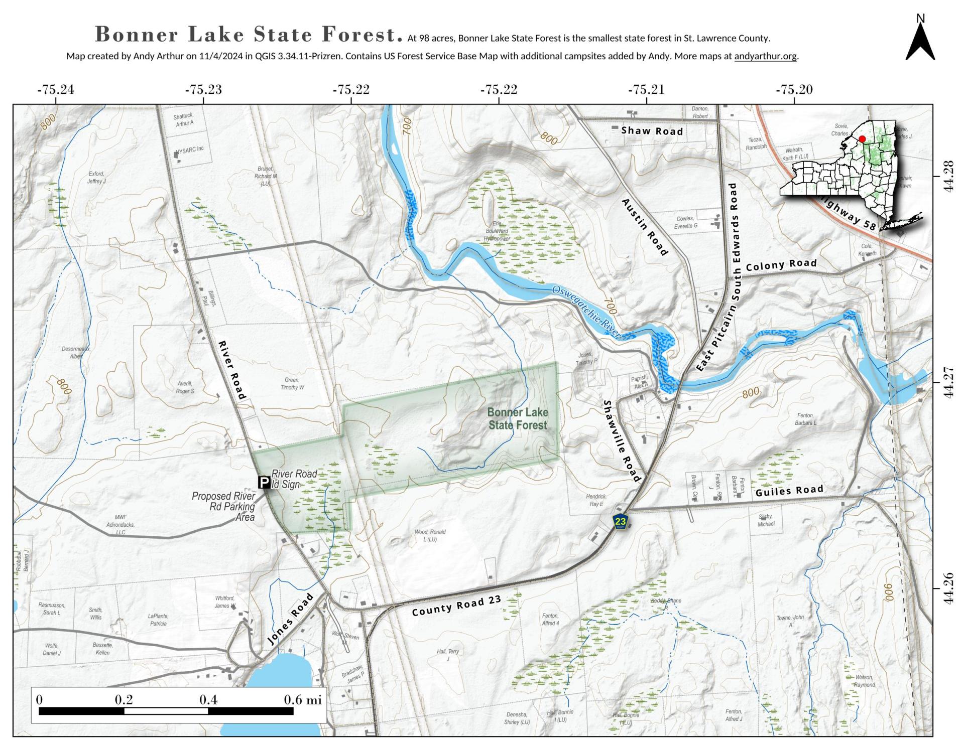 ... shows your location as a blue dot in relationship to campsites, trails, state land. This online map requires cell service, won't work in remote country, so also bring a paper map.