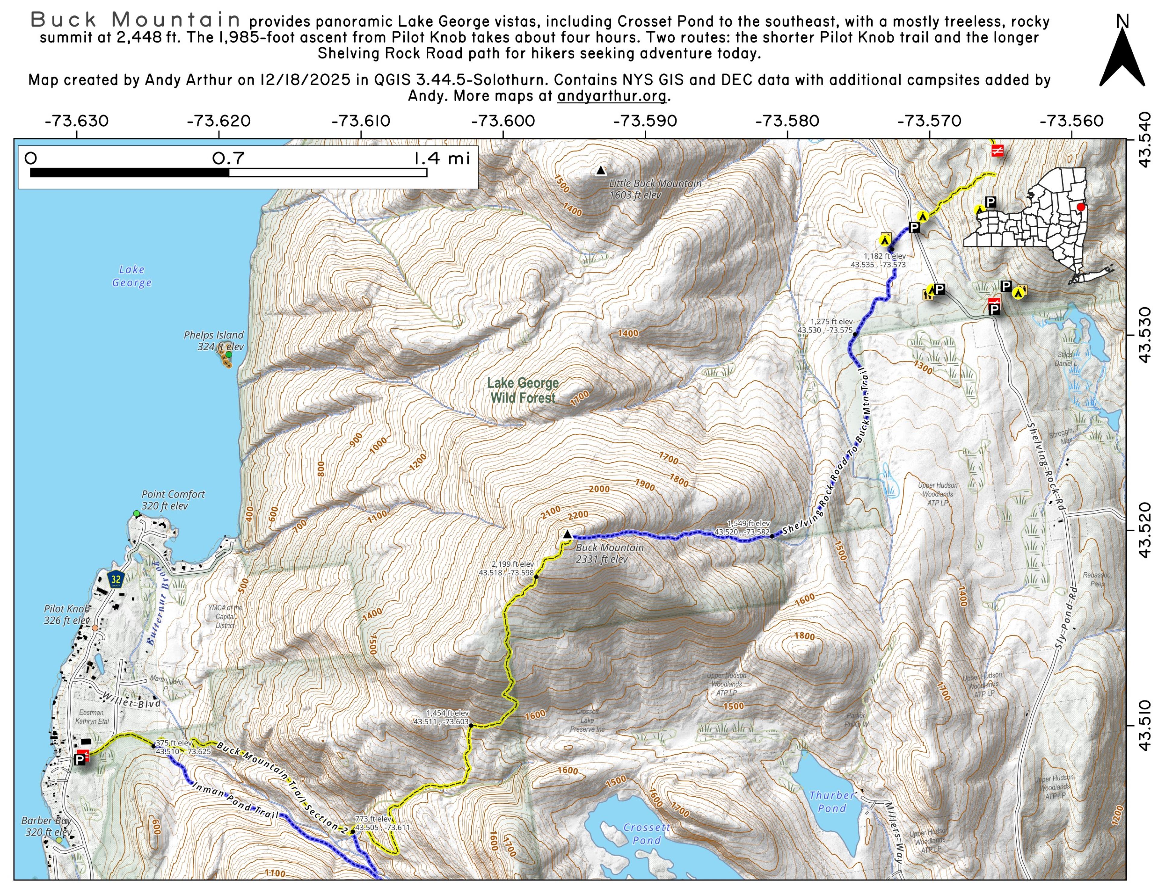 You'll only be going up 1,985 feet in this 4 hour climb from Pilot to the top of Buck Mountain at 2,448 feet. The summit is very rocky with great views all around. Over the lake on a clear day you will see the High Peaks towering to the north.