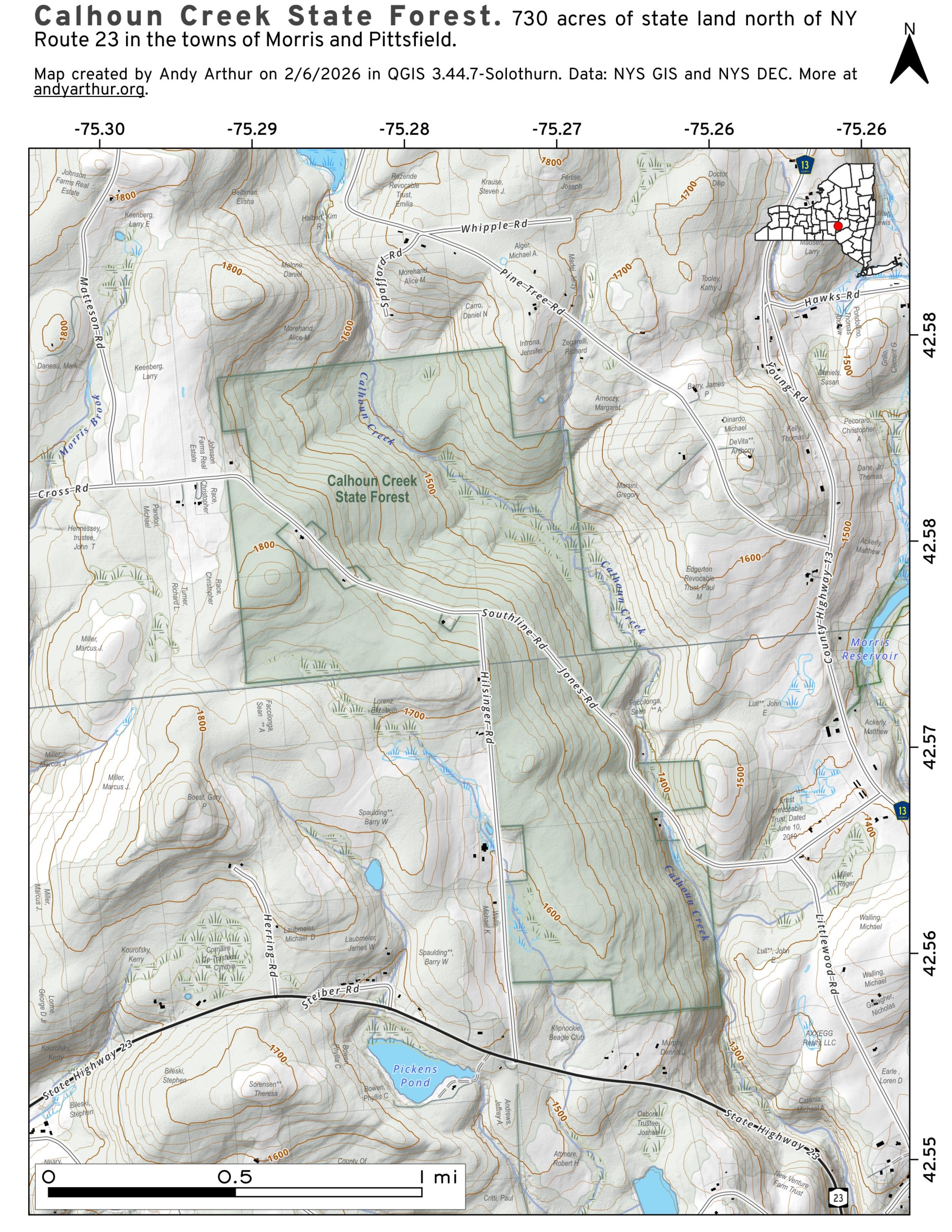 Calhoun Creek State Forest consists of 730 acres of land for recreational use located in the towns of Morris and Pittsfield.