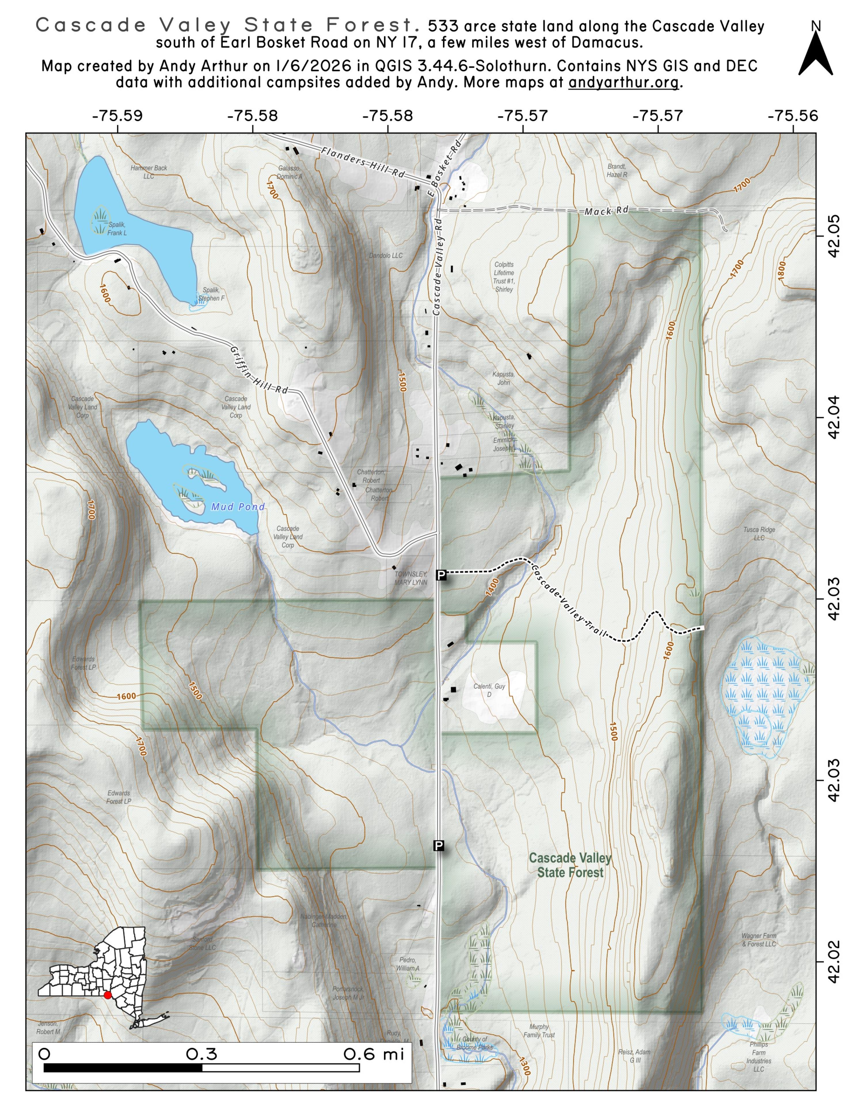 Cascade Valley State Forest covers 533 acres. A multiple use recreation trail runs east to west through the middle of the forest to the east of Cascade Valley Road. The forest was acquired in 1937 from one individual land owner. The forest is named for the tributary flowing through it which eventually flows into Cascade Creek.