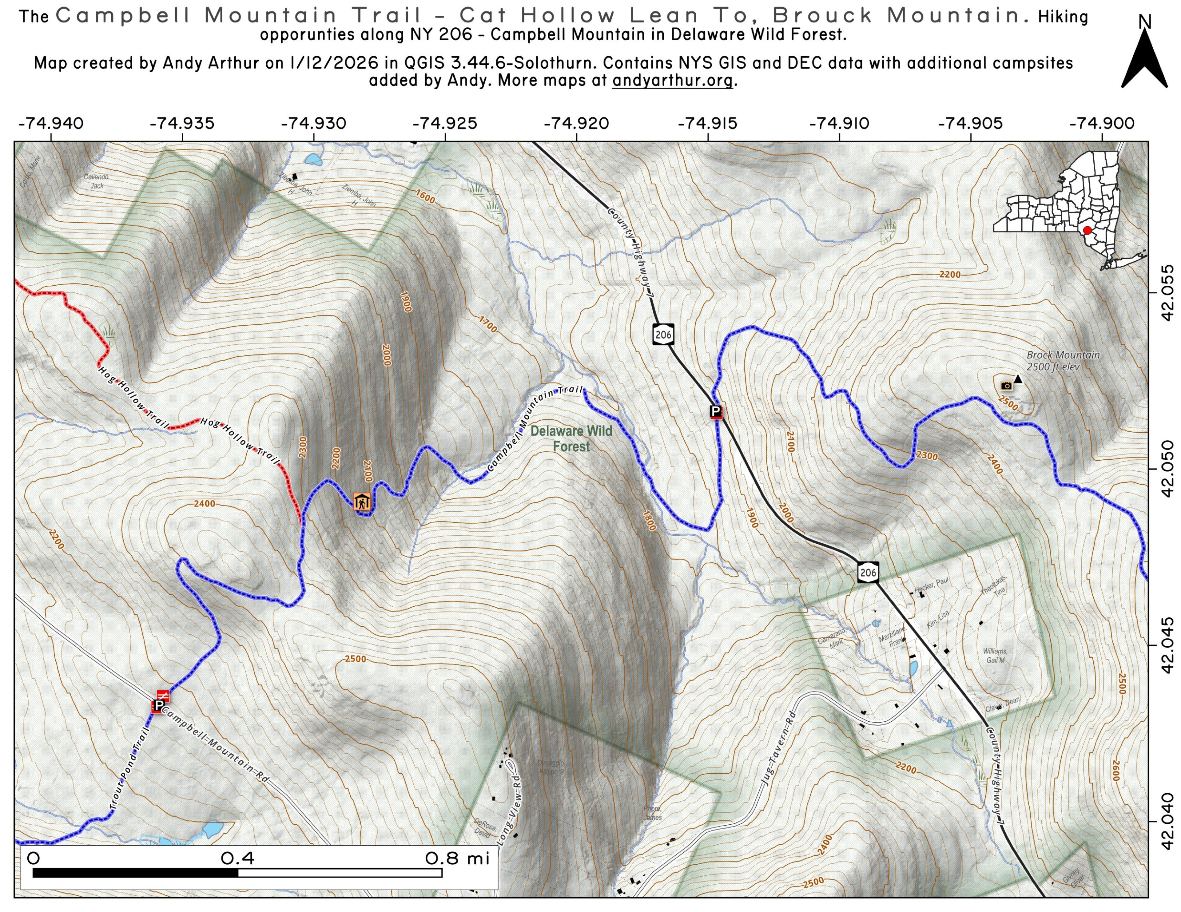 The Delaware Wild Forest is comprised of 27,800 acres of Forest Preserve land in the western-most part of the Catskill Park, falling within the counties of Delaware, Sullivan and Ulster. The unit is characterized by mountainous terrain, with grades ranging from moderate to steep. Approximately 33 miles of foot trails and 22 miles of snowmobile trails run through the Delaware Wild Forest, and ample opportunity for other recreational opportunities and solitude exist within the unit as well.