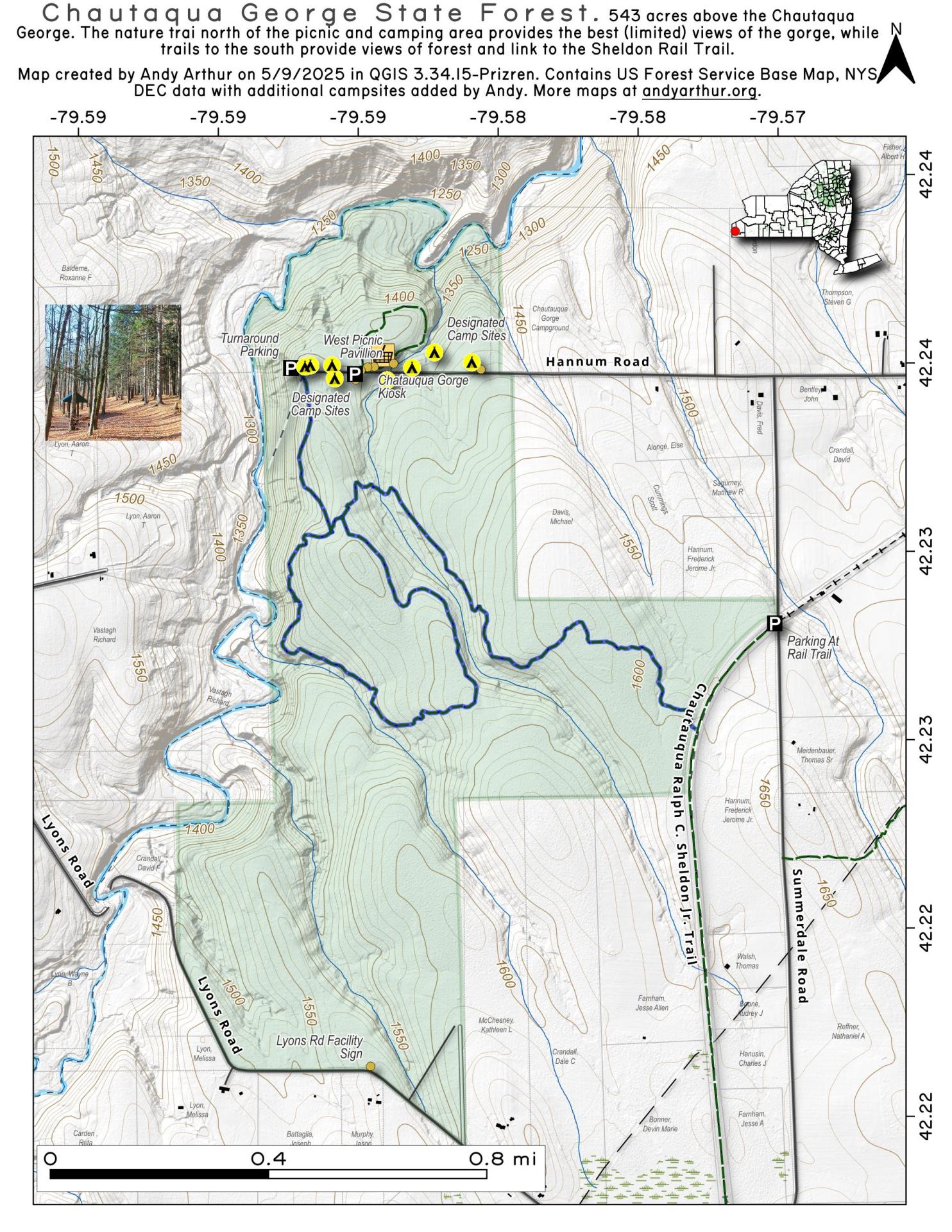 Camping logoThere are Eight designated camp sites on Hannum Road adjacent to the day use area. Seven of the sites are primitive tent sites with a rock fire ring, site number 8 is upgraded with a picnic shelter and steel fire ring. This site also has a gravel parking pad large enough for a small self contained camper unit. The sites are designated with a yellow camp disk. All camp sites are fist come, first serve. If you plan on staying more than three days, or have 10 or more people at a site you need to obtain a camping permit from the Forest Ranger by calling 716-771-7180.