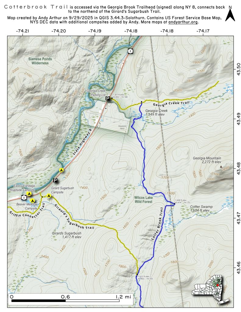 ... shows your location as a blue dot in relationship to campsites, trails, state land. This online map requires cell service, won't work in remote country, so also bring a paper map.