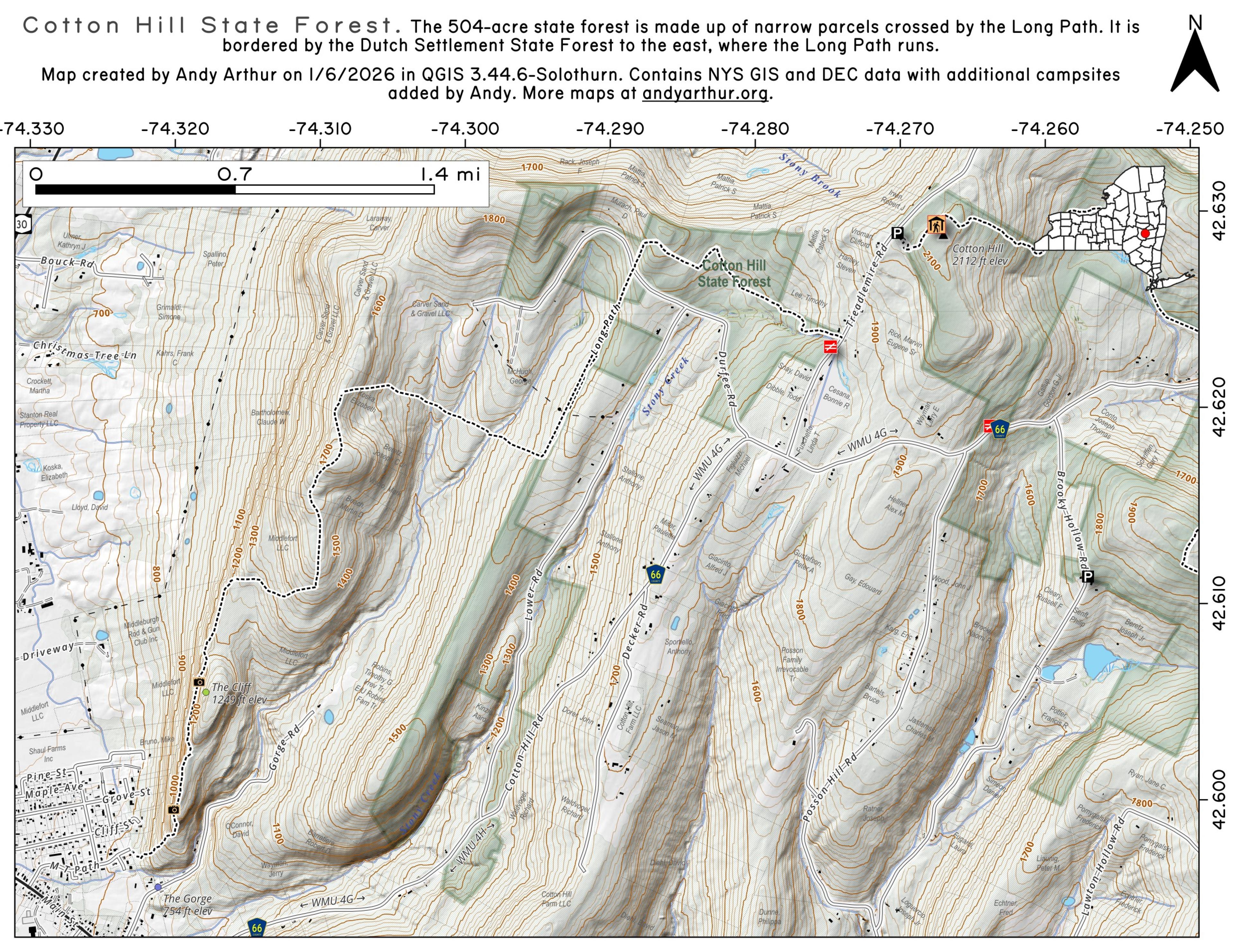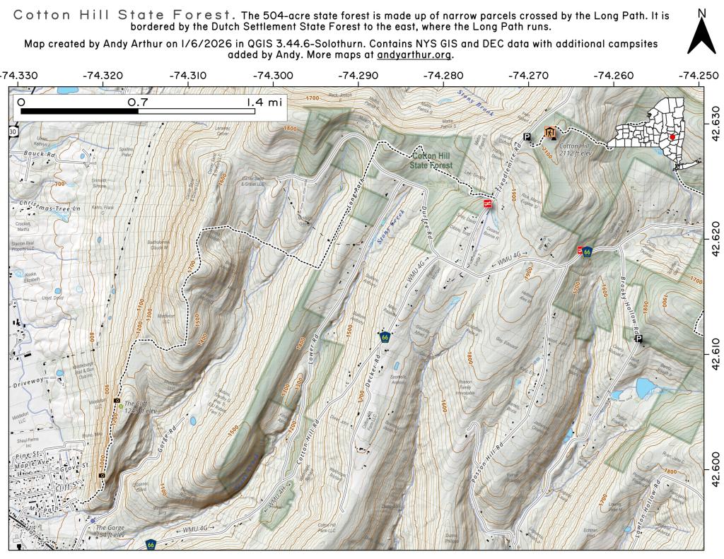 Located off of Lower Cotton Hill Road, the Cotton Hill State Forest borders the newer and more popular Dutch Settlement State Forest. At approximately 500 acres, the Cotton Hill State Forest is crossed by several snowmobile trails and the Long Path.