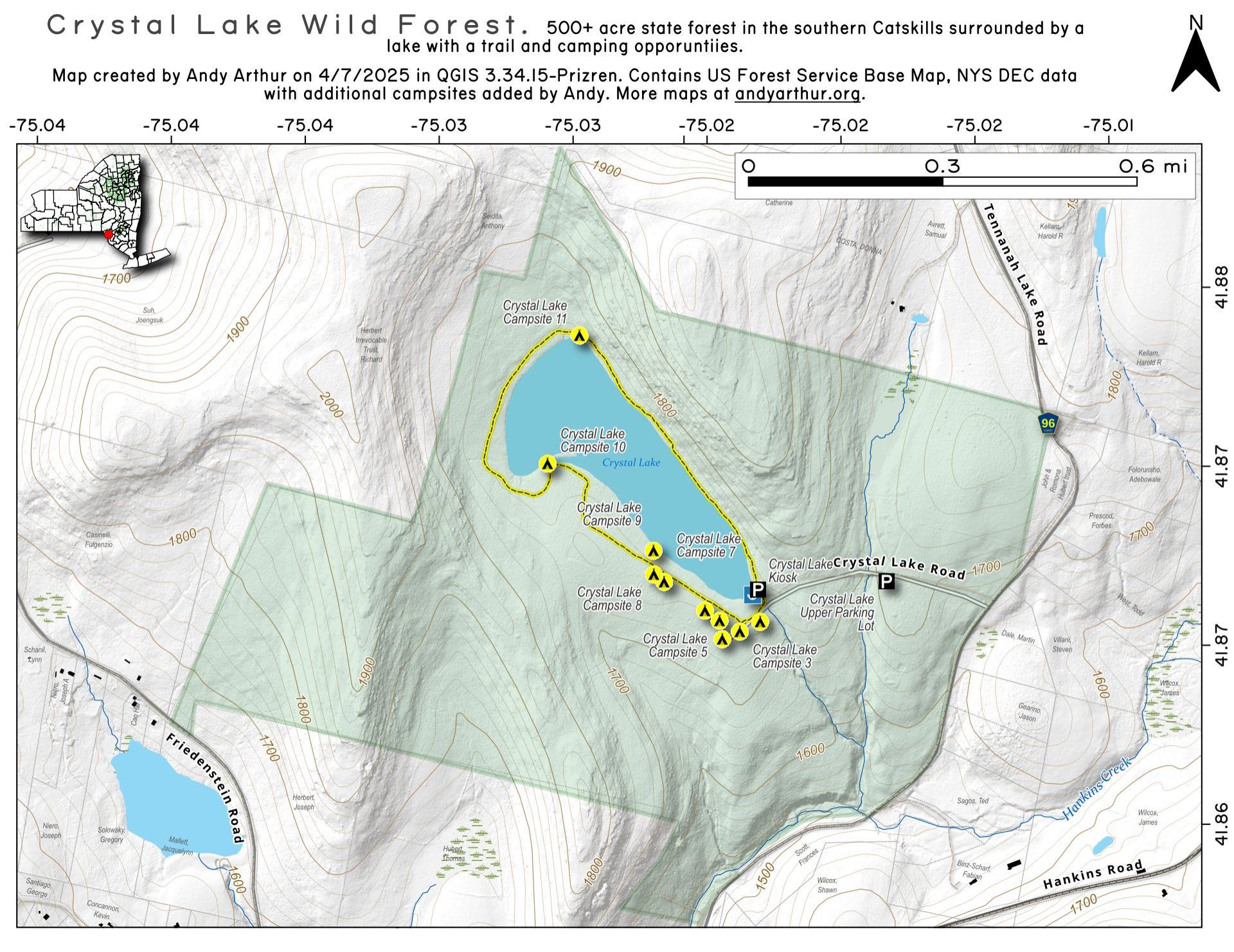 Crystal Lake Wild Forest is 497 acres, and includes a 32-acre man-made lake, seeps and streams, wetlands and an old beaver pond. The lake shore and surrounding moist woodland provide habitats for trilliums, wild leeks, Jack-in-the-pulpits and Dutchmens britches. The lake is surrounded by rolling hills (highest elevation 1,980 feet), quite steep along its eastern shore. This wild forest is in the Town of Fremont in Sullivan County. It is a "detached parcel" located outside of the Catskill Park.