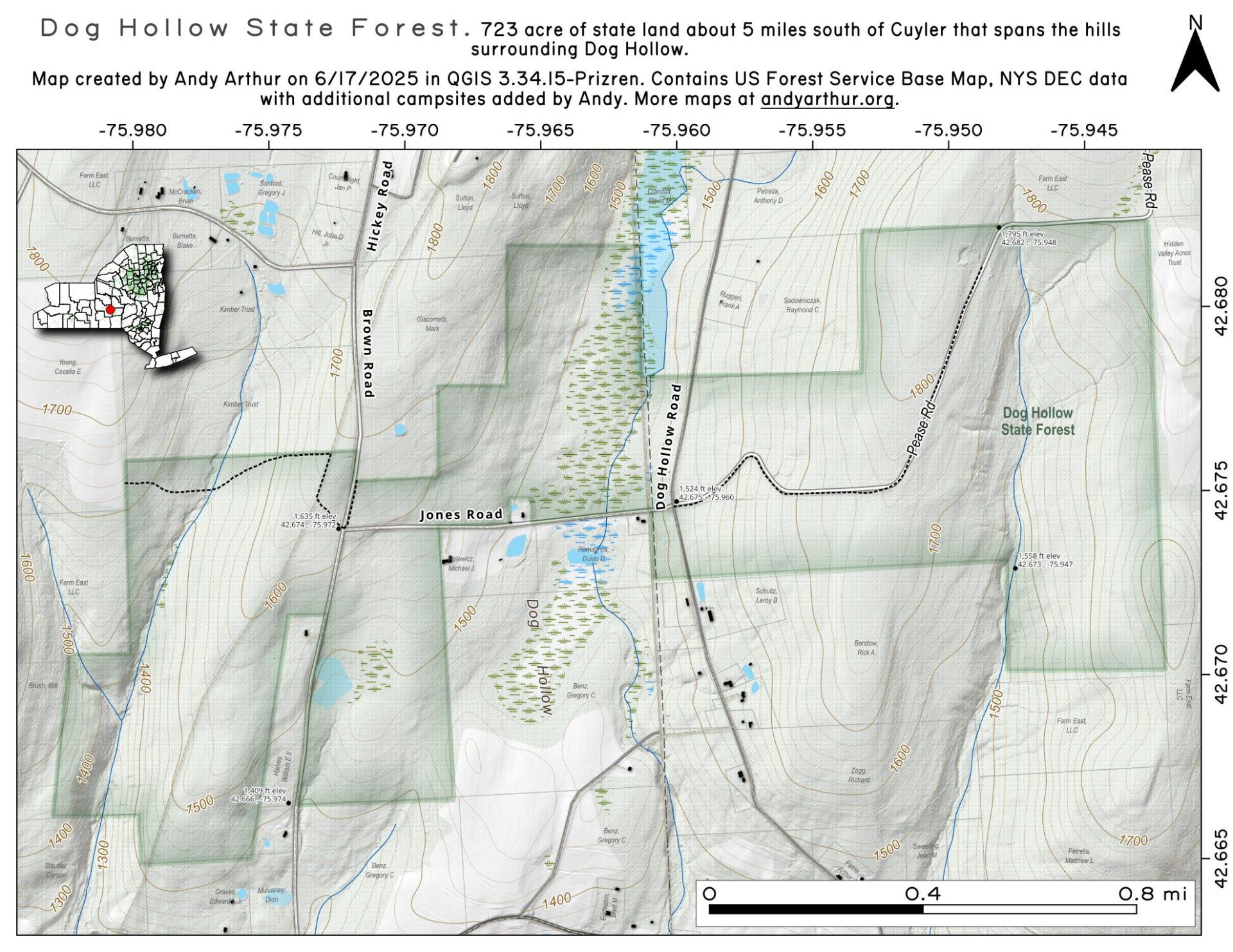 Dog Hollow State Forest encompasses 723 acres in Northeastern Cortland County. The Dog Hollow Public Forest Access Road provides recreational access to the interior of the eastern half of the forest. Popular recreational activities in Dog Hollow include hiking (informal, no trails), hunting, trapping, fishing, bird watching, trapping and snowmobiling.