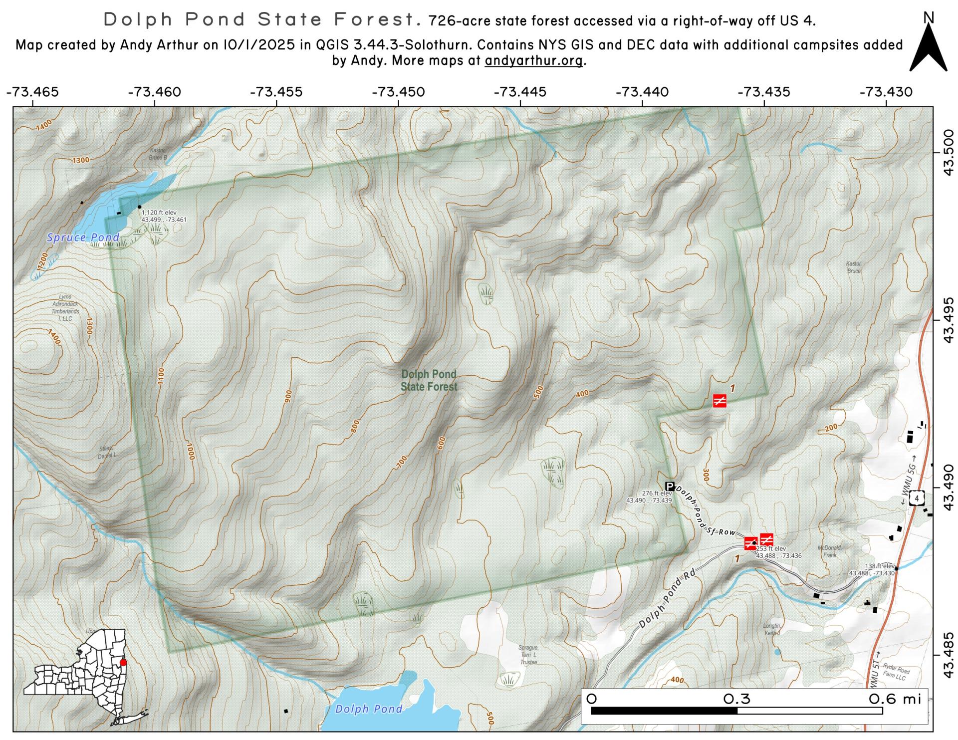 Dolph Pond State Forest is 726 acres of former Finch property that has been managed for forest products for over a half century. The logging history of the property can be seen in skid trails that allow access all over the property. Streams, hemlock and hardwood forests, and ample wildlife make wandering around this state forest a wonderful daytime activity. Visitors may hear occasional blasts from nearby mine sites while on the property. All activities are accessed from the parking area at the end of the right-of-way (ROW) off Dolph Pond Road. https://www.dec.ny.gov/lands/116871.html