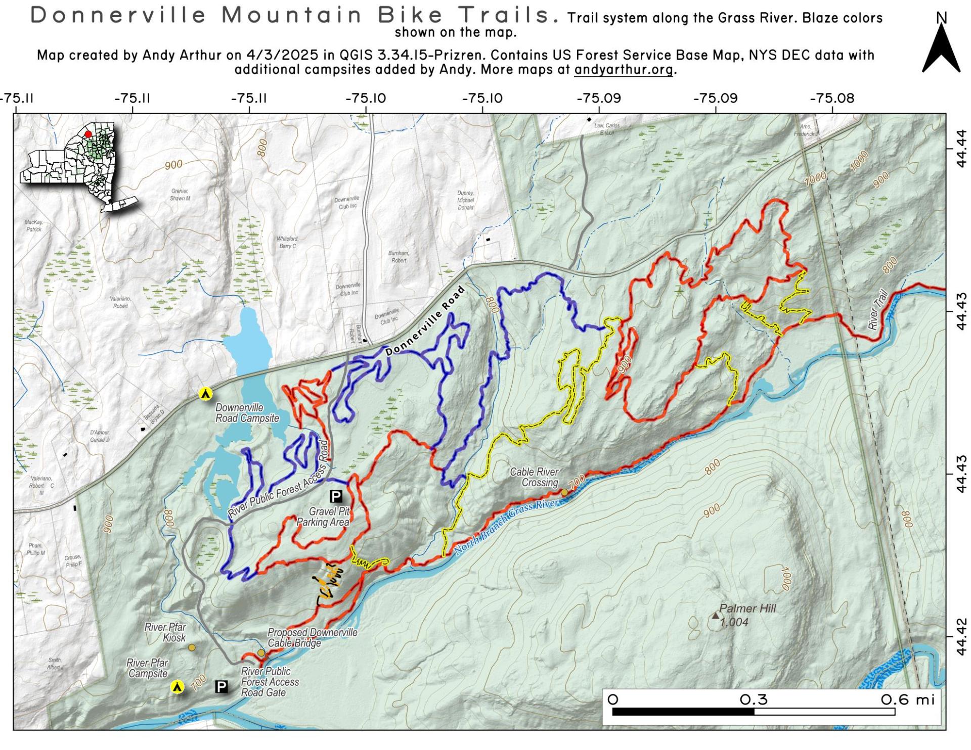 It is 1,638 acres, has one roadside campsite along a swampy pond, and several miles of trails to explore the gorge and Grass River. The trails south of Grass River can be difficult to access depending on the water levels (see DEC website for details).