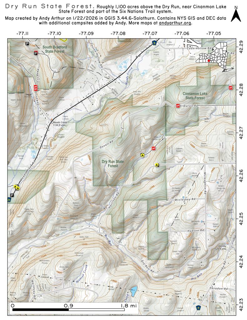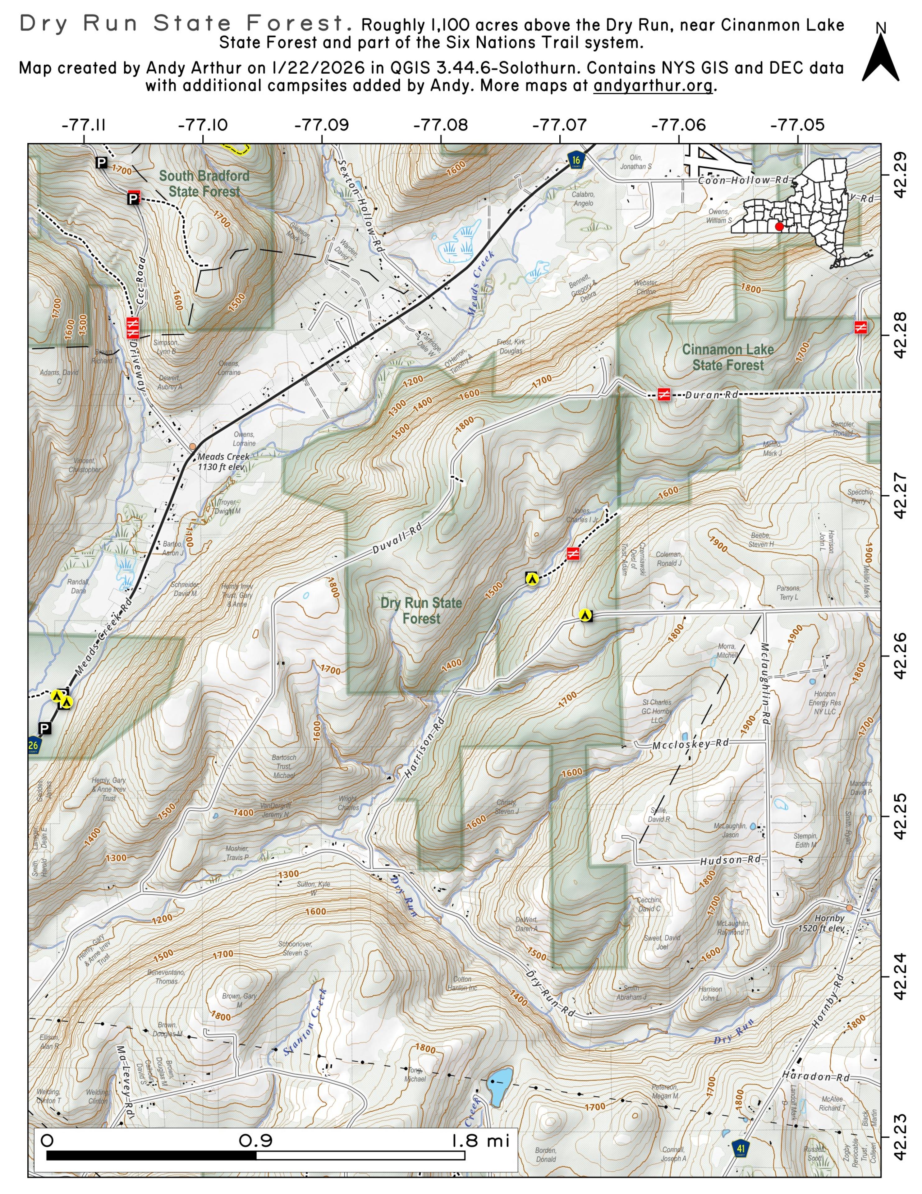 The 1,062-acre Dry Run State Forest has a limited amount of development. Most of this forest will require significant walking to access.
