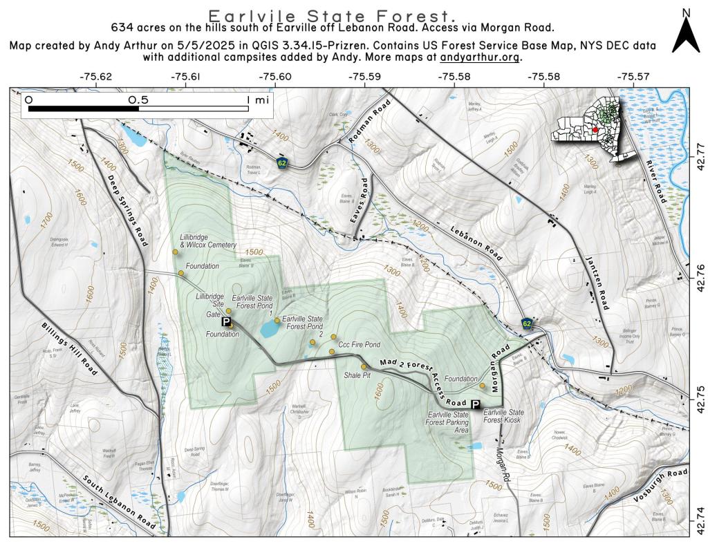 The Earlville State Forest, also know as Madison 2 , is 634 acres and is located in the town of Lebanon about two miles west of the village of Earlville, at an elevation of nearly 1600 feet. There is a camping site located along the truck trail . One is near a spring which has potable water. Songbirds stop off here during their spring and fall migrations. The forest is used by hunters seeking deer, turkey and gray squirrel. Morgan Road and the forest access road for the property are not plowed during winter months, however, a snowmobile trail passes through the state forest.