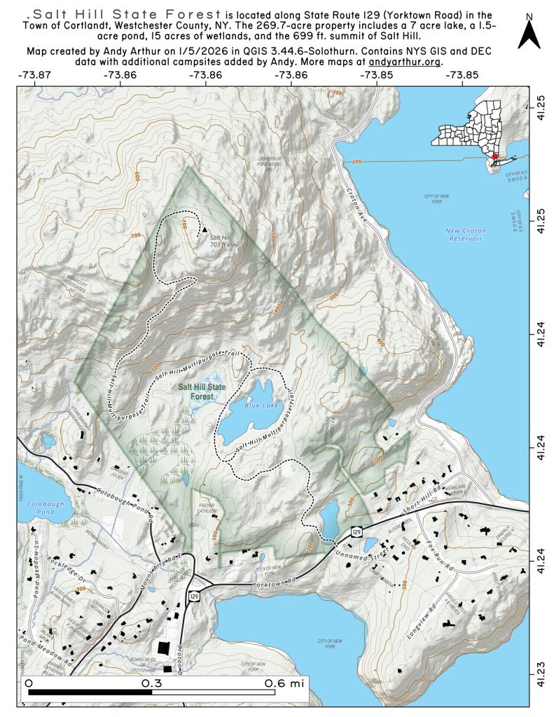 ... shows your location as a blue dot in relationship to campsites, trails, state land. This online map requires cell service, won't work in remote country, so also bring a paper map.