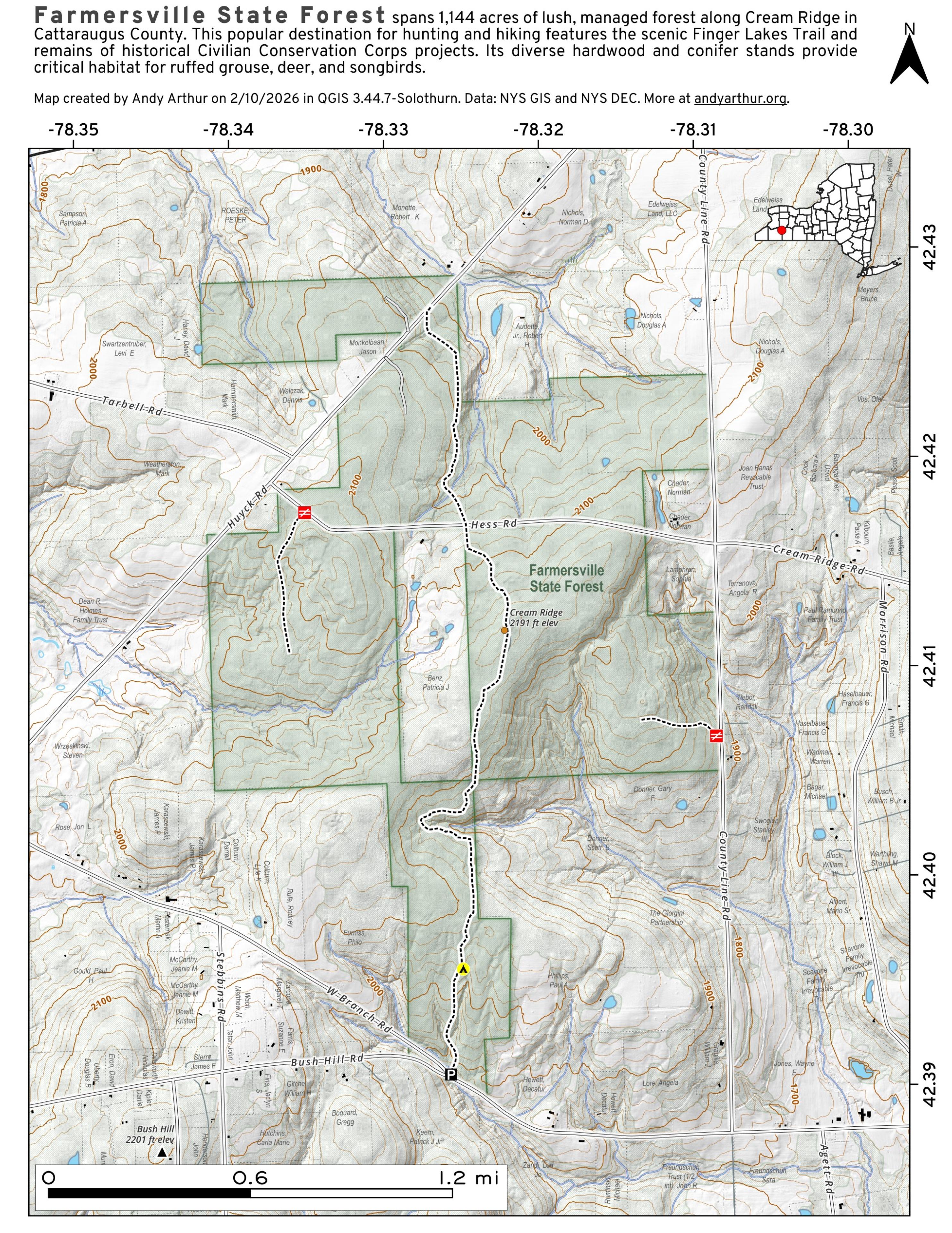 The 1,144-acre Farmersville State Forest is a popular hunting and hiking destination. There is one primitive designated campsite along the trail in the southern end of the state forest. The site is marked with a yellow marker. The Finger Lakes Trail crosses this property.