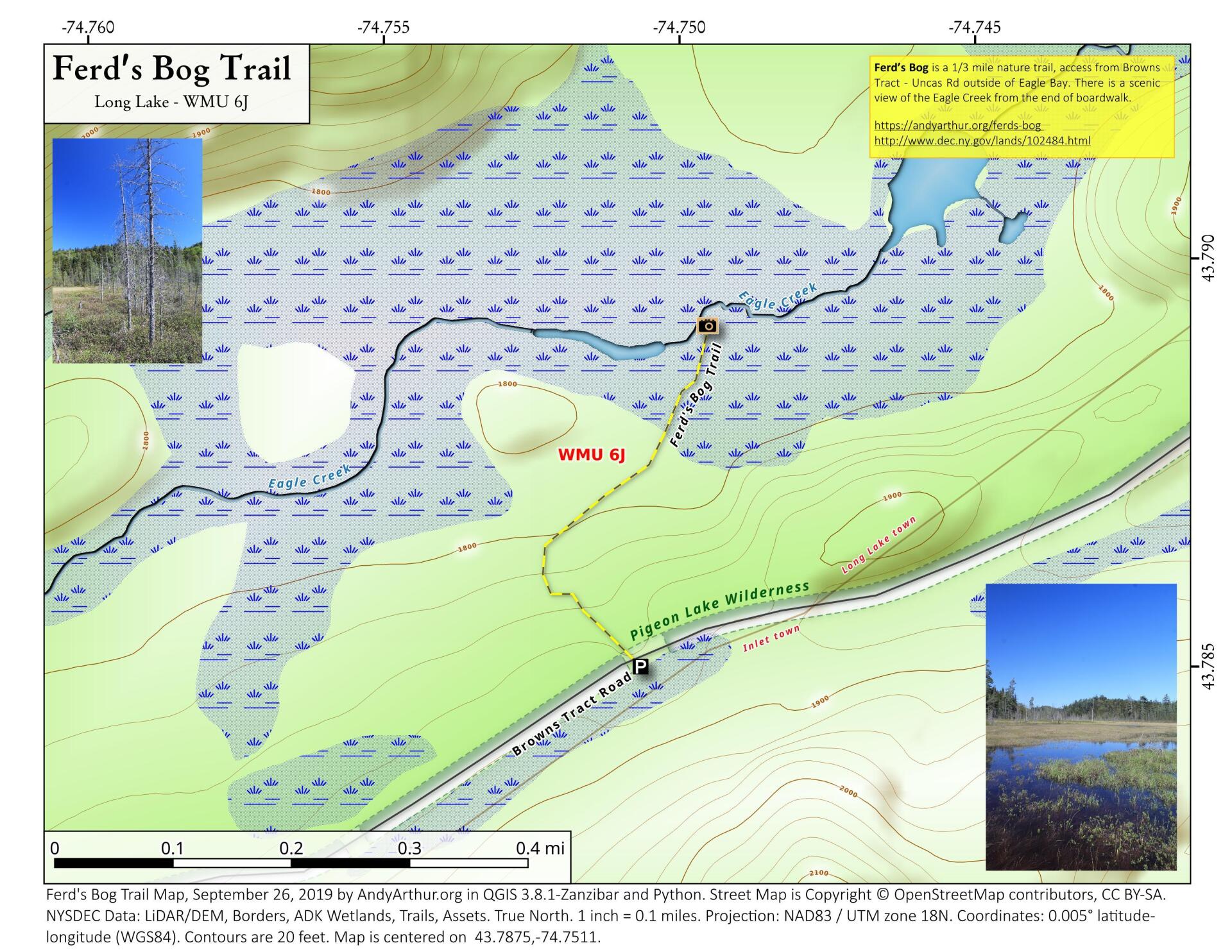 A 50-acre black spruce bog, stream, and bog pond surrounded by 50 acres of boreal forest with a representative bird community including ...Three-toed Woodpecker, Black-backed Woodpecker, Olive-sided Flycatcher, Yellow-bellied Flycatcher, Gray Jay, Boreal Chickadee, and Lincoln's Sparrows.