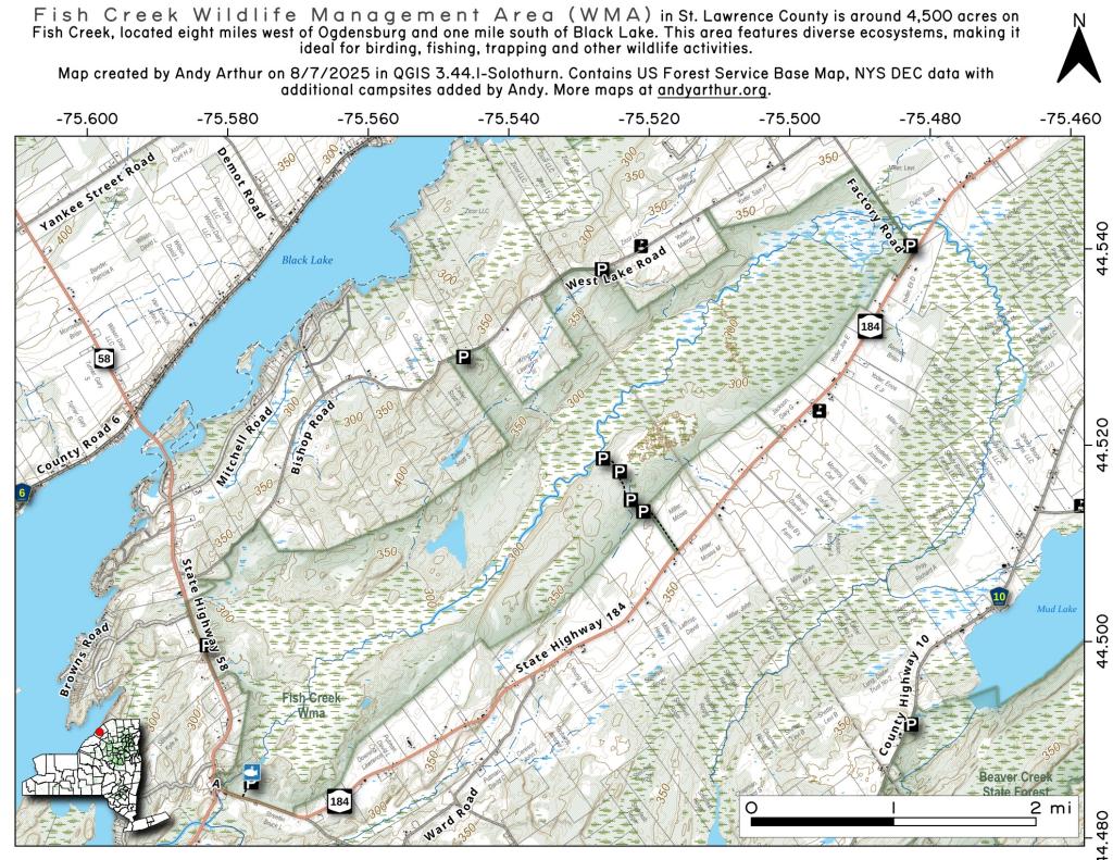 The Fish Creek Wildlife Management Area (WMA) is a 4,438-acre tract of land located in southwestern St. Lawrence County, eight miles west of the city of Ogdensburg and one mile south of Black Lake. There are 2,046 acre natural wetland which is primarily an emergent marsh whose water level is dependent on the many beaver dams on the Fish Creek drainage and 2,392 acres of upland most of which is forested. The emergent marsh is mainly cattail with flooded shrubs interspersed throughout the area. There is a hardwood swamp along the fringe of the emergent marsh. The upland portion contains approximately 1000 acres of softwood scattered throughout the area which deer use as wintering areas and 861 acres of young northern hardwoods that are being managed using commercial forest sales. There are 93 acres of open grassland maintained for ground nesting birds.