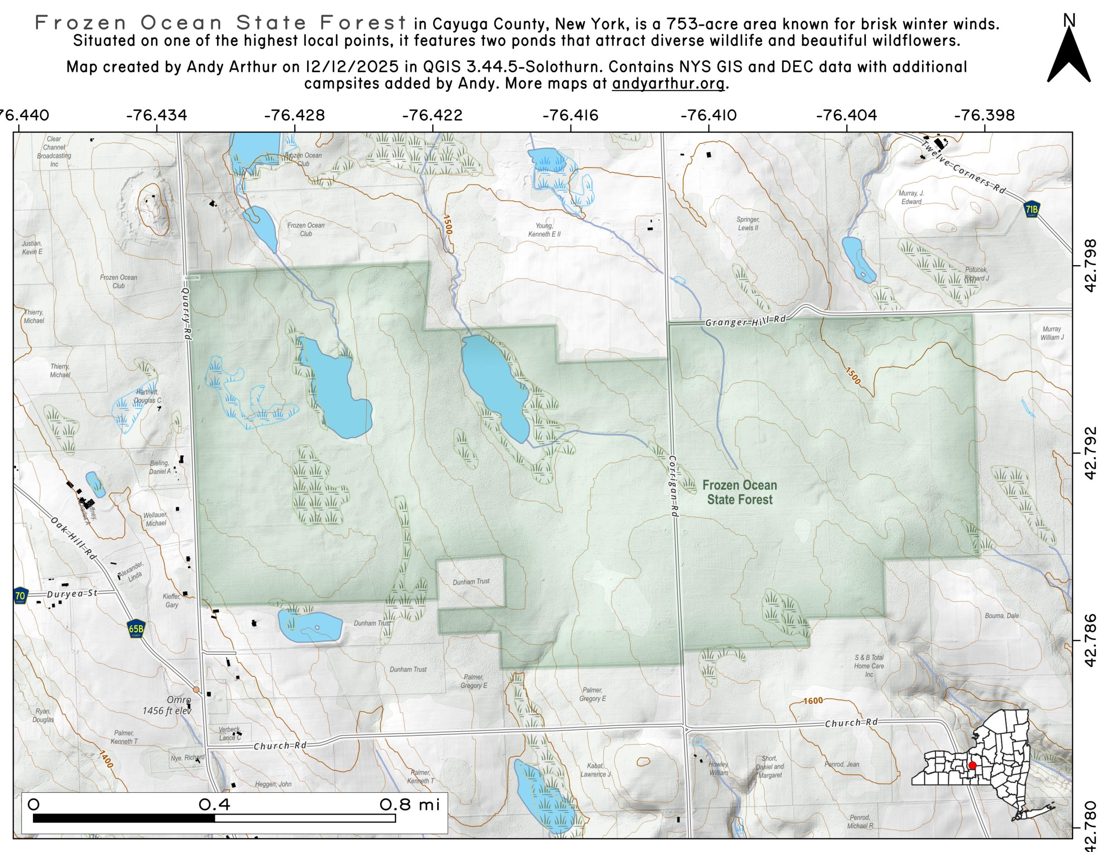 Frozen Ocean State Forest encompasses 754 acres of land in the town of Niles in Southeastern Cayuga County. There are no trails on this state forest. Recreational activities are limited to hunting, fishing, trapping,primitive camping, and nature photogrpahy/observatin. Situated on one of the highest points in the county, Frozen Ocean is well known for receiving more than its fair share of freezing winds in the winter.