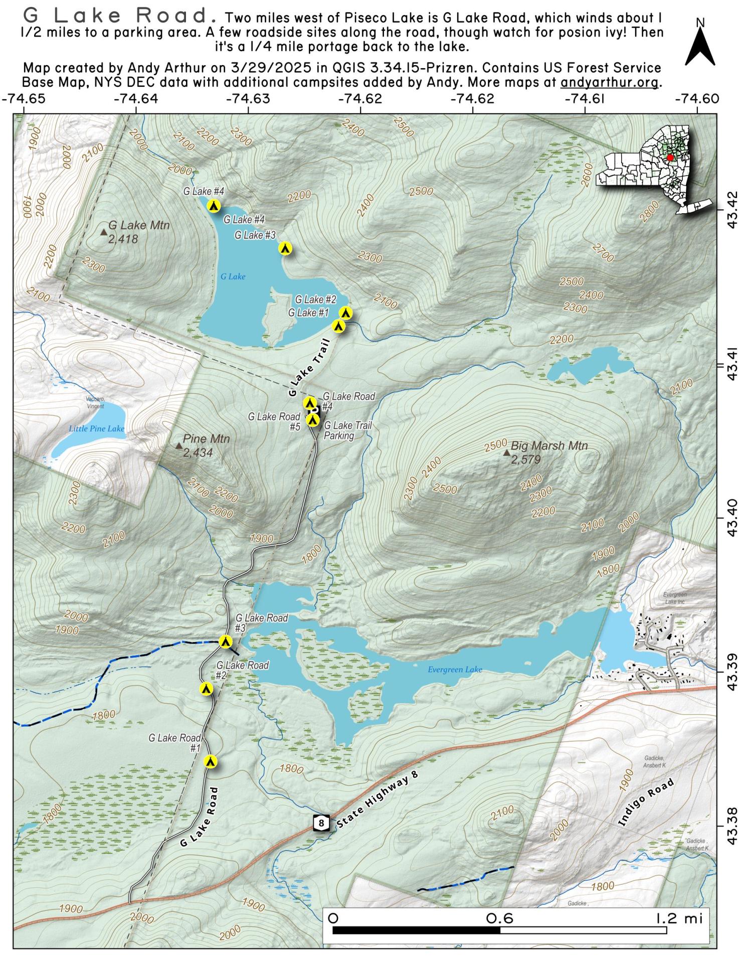 Located off of NY 8, about 2 miles west of Piseco Road, G-Lake Road runs for about 2.5 miles to a parking area. From there it's a 1/3 mile walk/portage to G-Lake, a smaller man-made lake, that somewhat resembles a lower-case 'g' on a warn out typewriter. There are a couple of very rustic roadside campsites on G-Lake Road, along with a handful of campsites around G-Lake. It supposedly has good fishing.