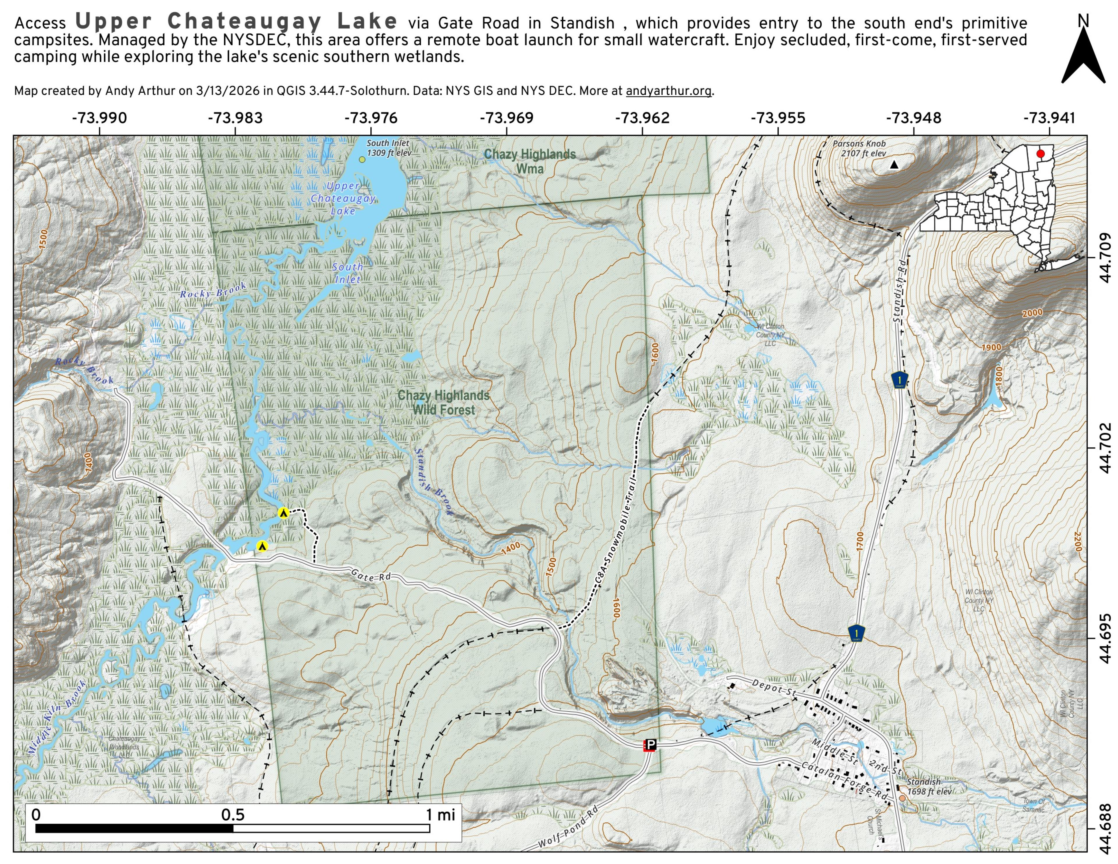 The Chazy Highlands has very few developed recreational facilities. Recreational activities which do occur in the unit include hunting, fishing, and hiking. State Routes 3 and 374 bisect the area, providing access to the facilities and resources. Important local roads for access include County Route 26 (Old Route 99), Standish Road, and Plank Road.
