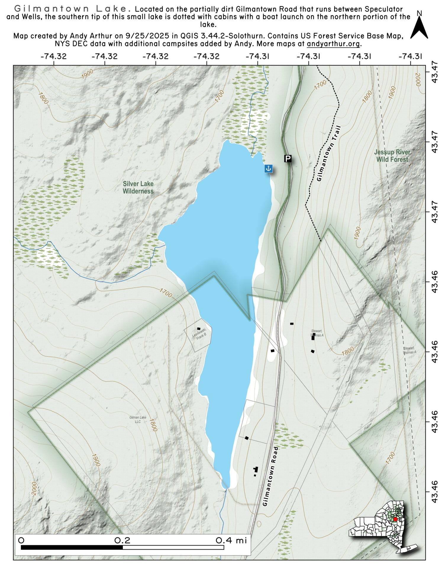 Located between the Silver Lake Wilderness and Jessup River Wild Forest, Gilman Lake offers paddling and fishing opportunities. Not the most remote or largest lake in the Adirondacks, it's a little ways south of Speculator on Gilman Lake Road.
