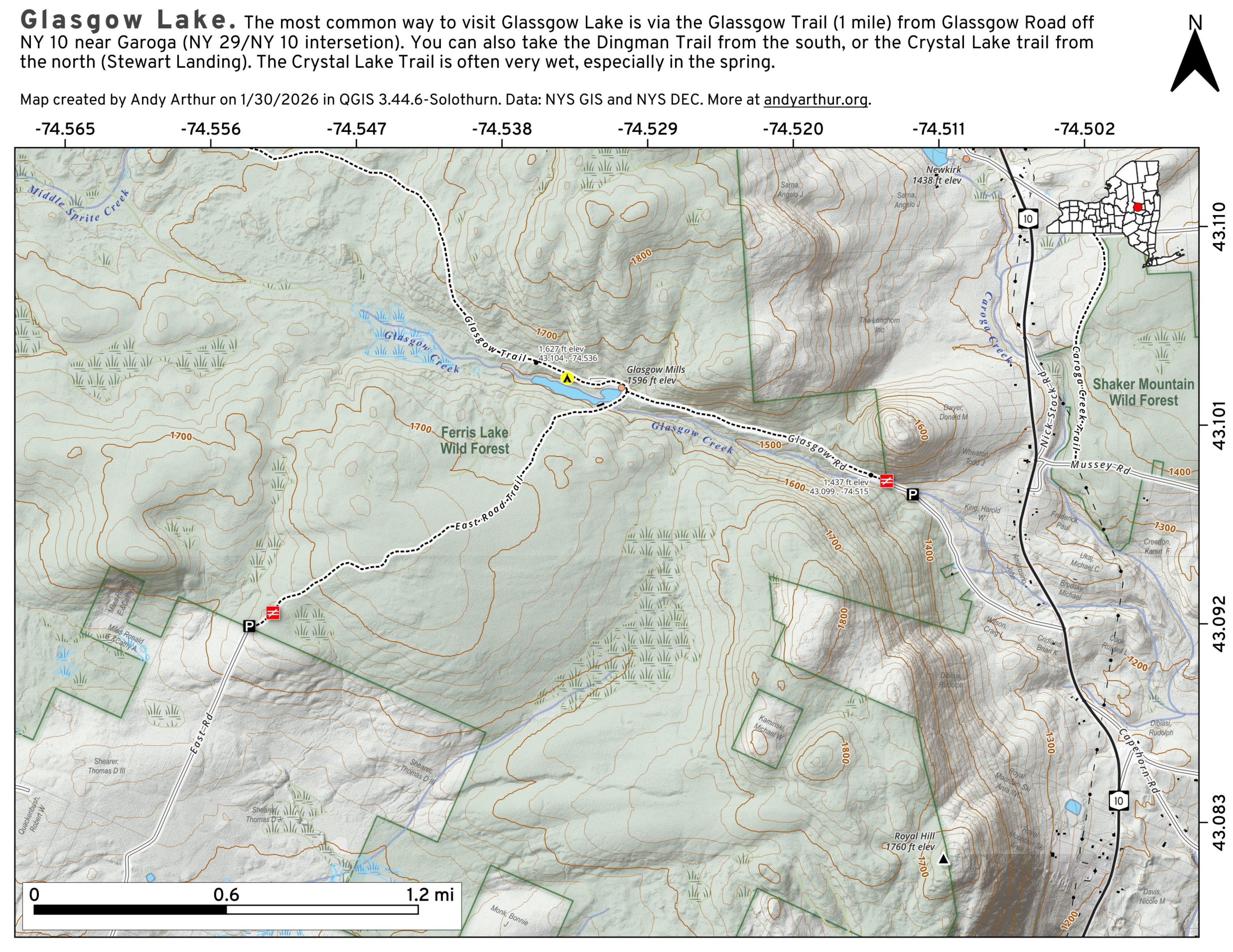 Glasgow Lake is a man-made scenic lake, home to the historic Glasgow Mill remains, about 9/10th of a mile from Glasgow Mill Roads off of NY 10.