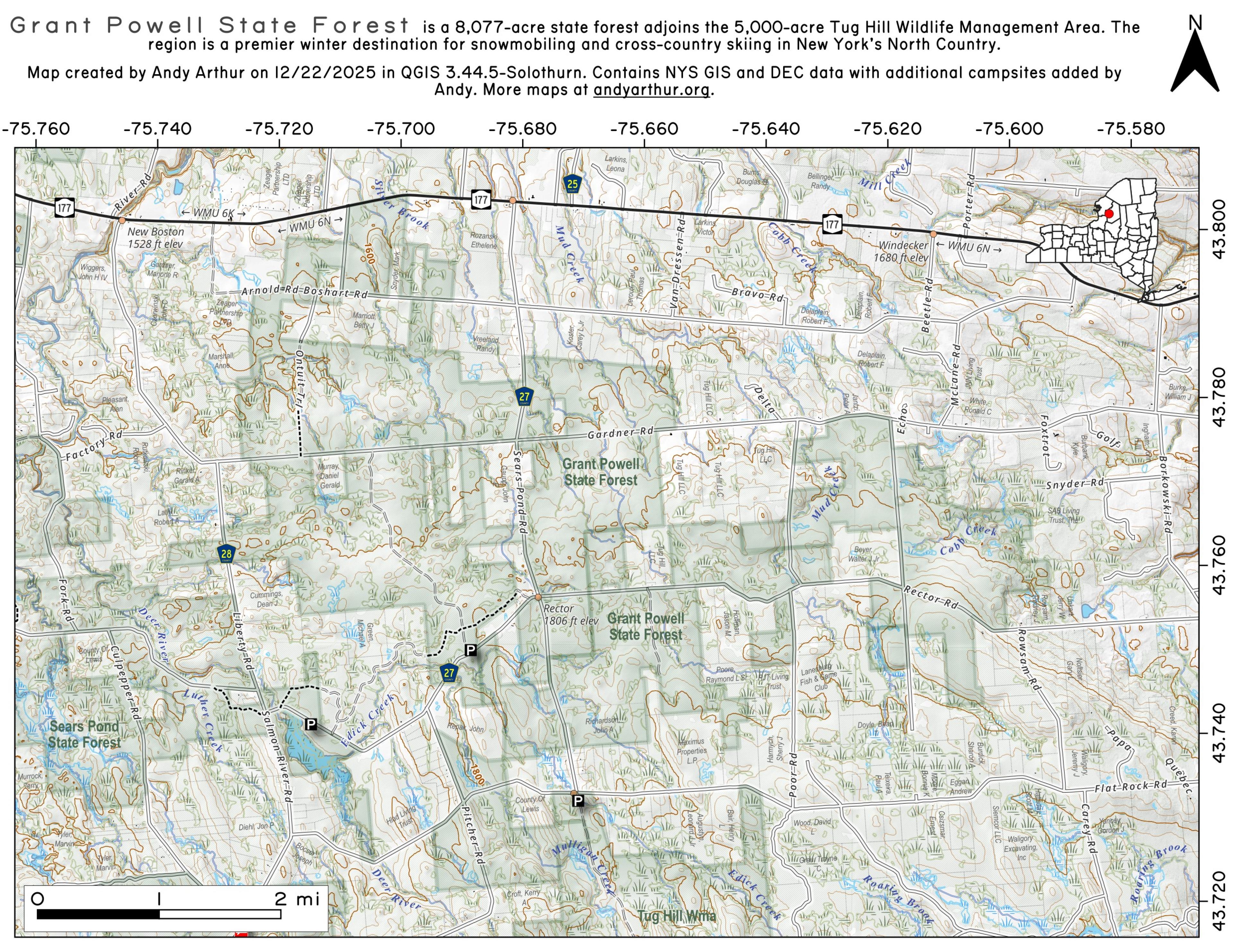 This 8,077-acre state forest is named after the first state district forester appointed to the Lewis-Jefferson County area. He was instrumental in most of the original local state land acquisition projects that formed the basis for the state forests that exist here today. A memorial plaque and small parking site established by his friends and co-workers can be seen along the south side of State Route 177. Adjoining this state forest to the south is the Tug Hill Wildlife Management Area that contains more than 5,000 acres of public land dedicated to the enhancement of native wildlife. Every winter large numbers of snowmobilers and cross country skiers journey to the North Country to enjoy the deep winter snow conditions of this state forest and adjacent properties.