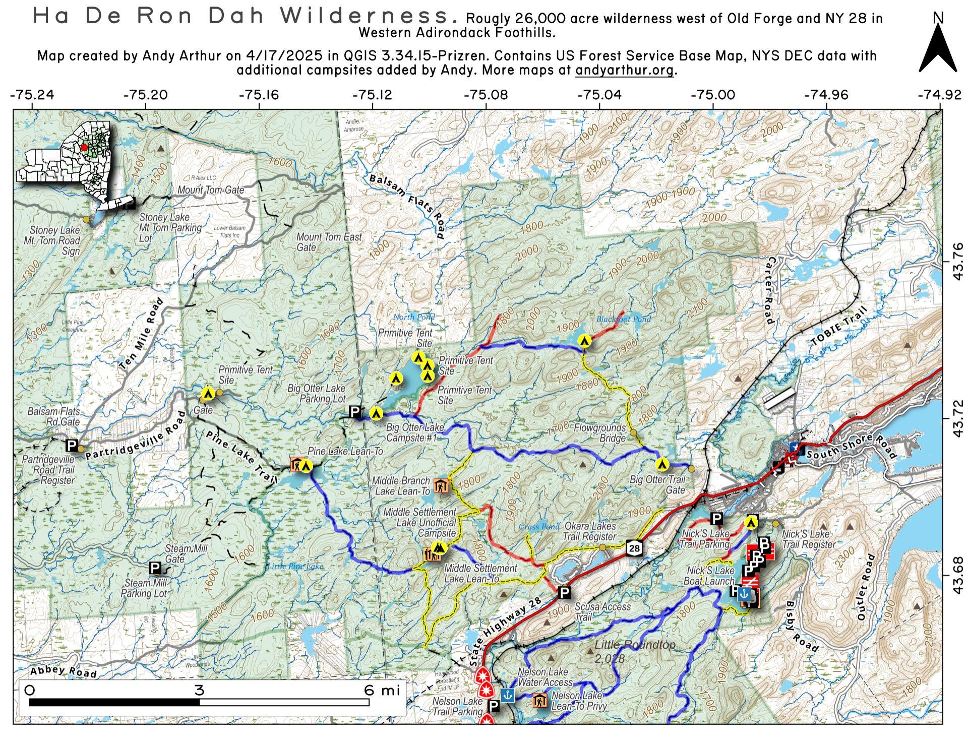 The Ha-De-Ron-Dah Wilderness contains 26,600 acres and is located in the western foothills of the Adirondack Mountains, west of the hamlet of Old Forge and the Fulton Chain of Lakes and east of Independence River Wild Forest. While not the grandeur of a "High Peaks" wilderness experience, Ha-De-Ron-Dah has plenty to offer for those seeking solitude within the Adirondack Forest Preserve.