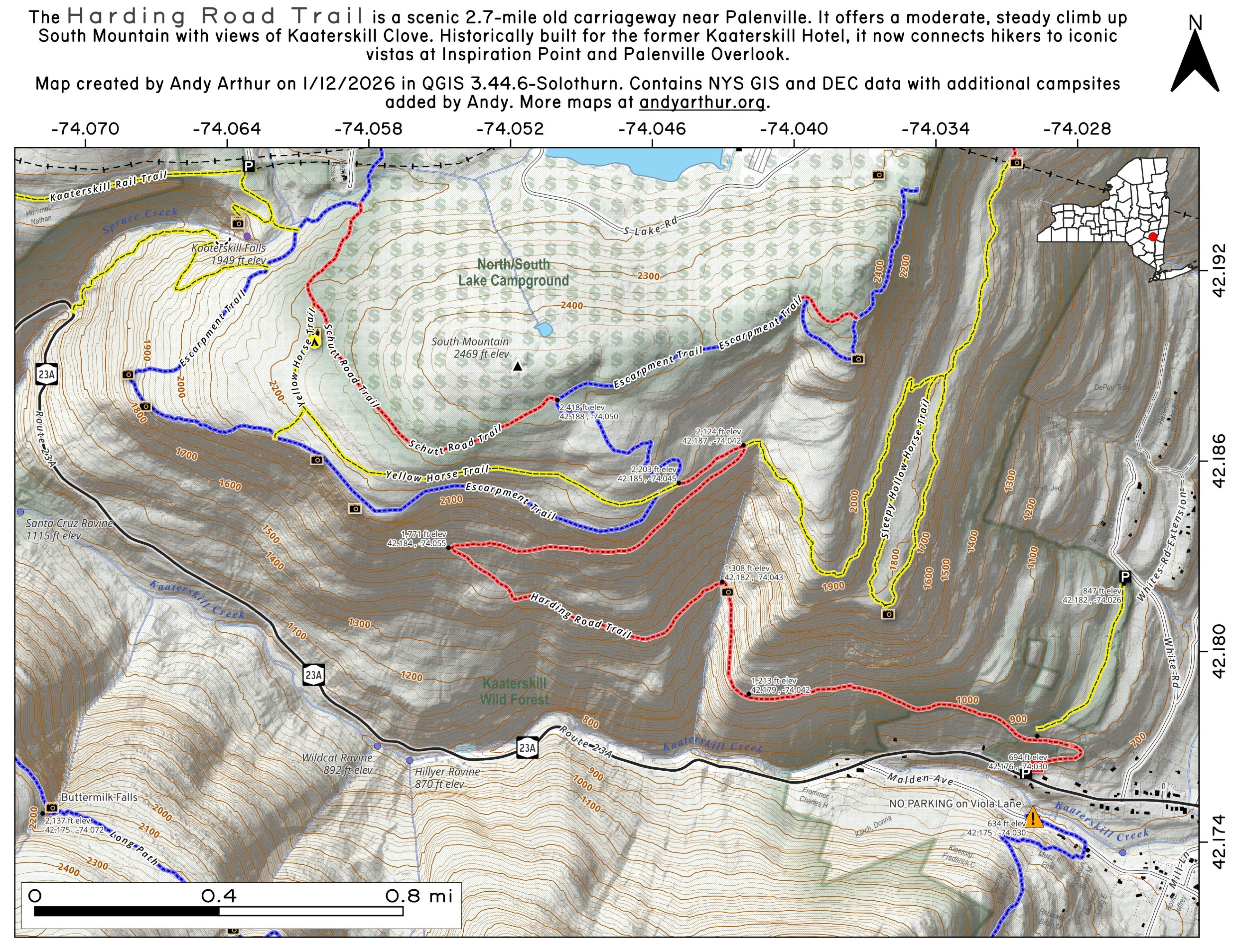 The Harding Road Trail is an old carriageway built to the former Kaaterskill Mountain House, long abandoned but still largely remaining 25-foot wide road cut into the side of South Mountain, running 2 miles from Palenville to the old carriageway looping around South Mountain. Additional parking is available along Whites Road.