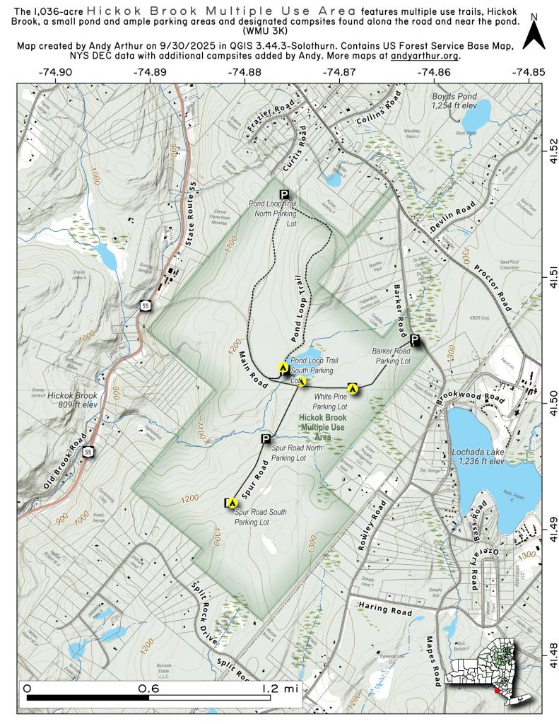 Hickok Brook Multiple Use Area is primarily accessed from an easy to find ample parking area located off Barker Road in the Town of Highland. Camping is available at Hickok Brook MUA as well as a variety of trails, though the markers are difficult to see. There are a variety of roads that lead to campsites β€” the pull-offs to the right are for camping, while straight ahead is a dead end and left is another dead end with more campsites, marked with yellow DEC markers.