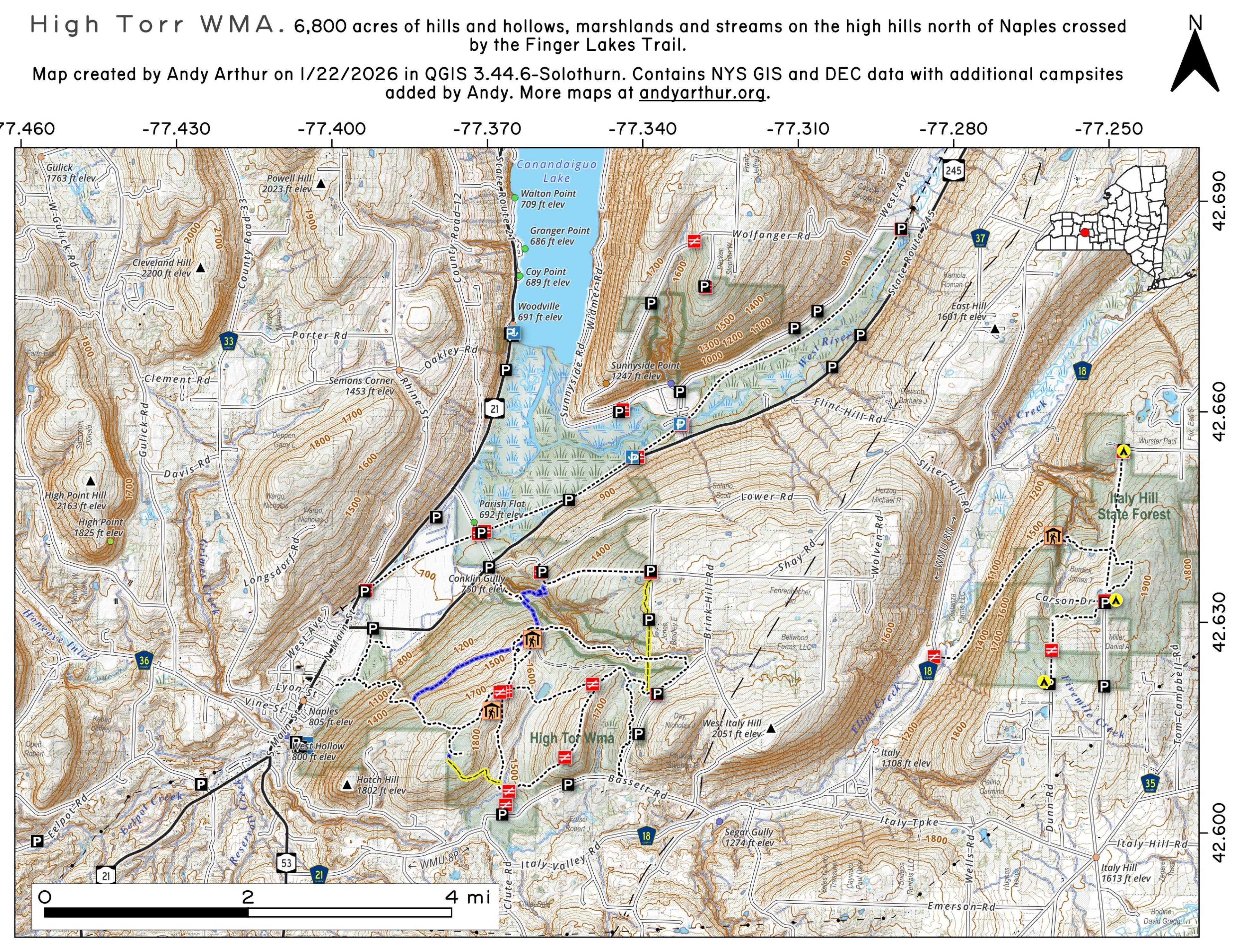 The High Tor Wildlife Management Area (WMA) consists of approximately 6,800 acres. It has numerous ecological habitats with many steep wooded hills, gullies, eroded cliffs, and wetlands. The largest part of High Tor WMA is approximately 3,700 acres just east of the Village of Naples and is primarily scenic, steep wooded terrain. It is intersected by administrative truck trails usable as foot access to the more remote sections of the area. Immediately north of this area are about 2,200 acres of lowland marsh, forested wetland, and grassland which lies between State Routes 21 and 245, bordering Canandaigua Lake and extending up West River valley. This area is drained by the famous Naples Creek. East of the southern end of Canandaigua Lake is a third part of the area known as South Hill. This portion is composed primarily of 900 acres of overgrown fields with steep wooded hillsides.