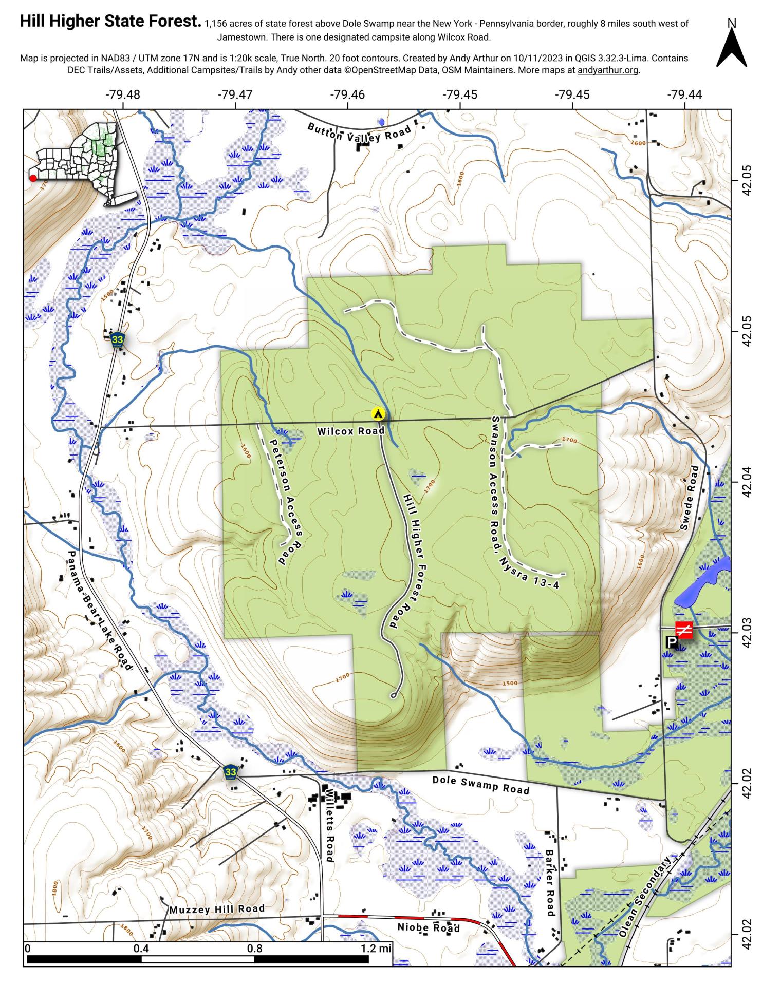 Hill Higher State Forest (Chautauqua #13) totals 1,156 acres, and is located in the town of Harmony, south of the village of Panama in the south central part of Chautauqua County. This forest provides opportunities for many outdoor recreational activities and is home to a variety of wildlife species.