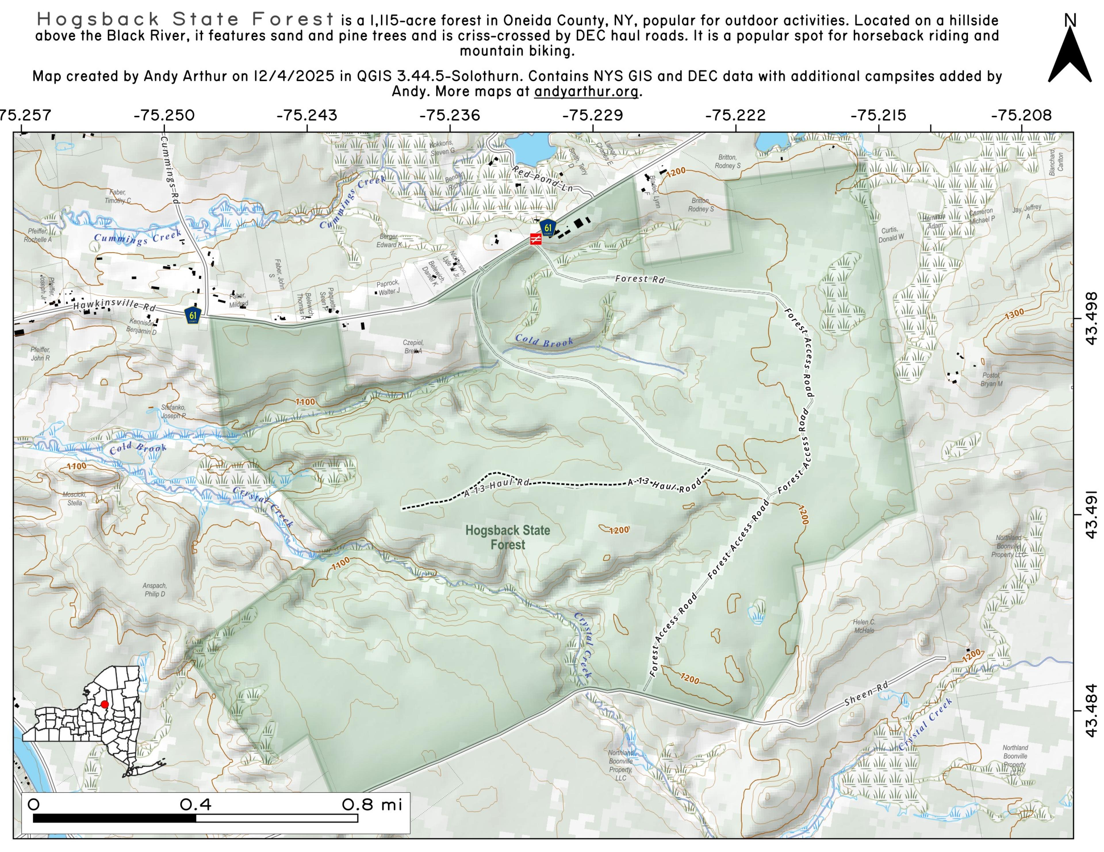Located outsdie of Hawkinsville on the hillside above the Black River, Hogsback State Forest is 1,115 acres of sand and pine tress, criss-crossed by several DEC haul roads, popular for horseback riding and mountain biking.