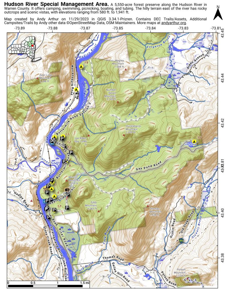 The Hudson River Special Management Area (HRSMA), also known as the Hudson River Recreation Area, or sometimes simply Buttermilk, is located on the eastern shore of the Hudson River in the Lake George Wild Forest. It includes 5,550 acres of forest preserve lands in the towns of Warrensburg and Lake Luzerne in Warren County.