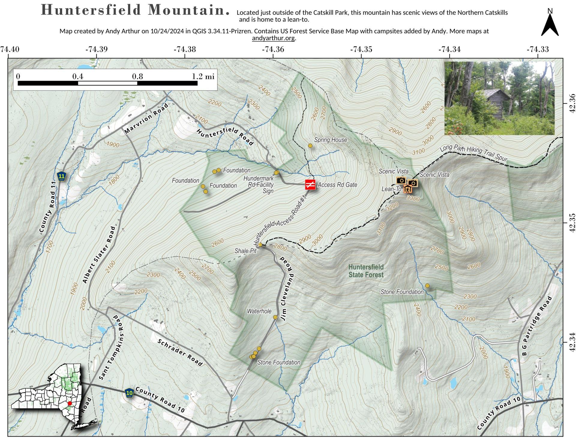 Huntersfield Mountain is located southwest of Albany, just north of Catskill Preserve, and is about 2.5 hours from the Syracuse area. Huntersfield Mountain at 3423 feet, is highest point in Schoharie County. The mountain is located in the southern part of the county along the border with Greene County in the 1325 acre Huntersfield State Forest.