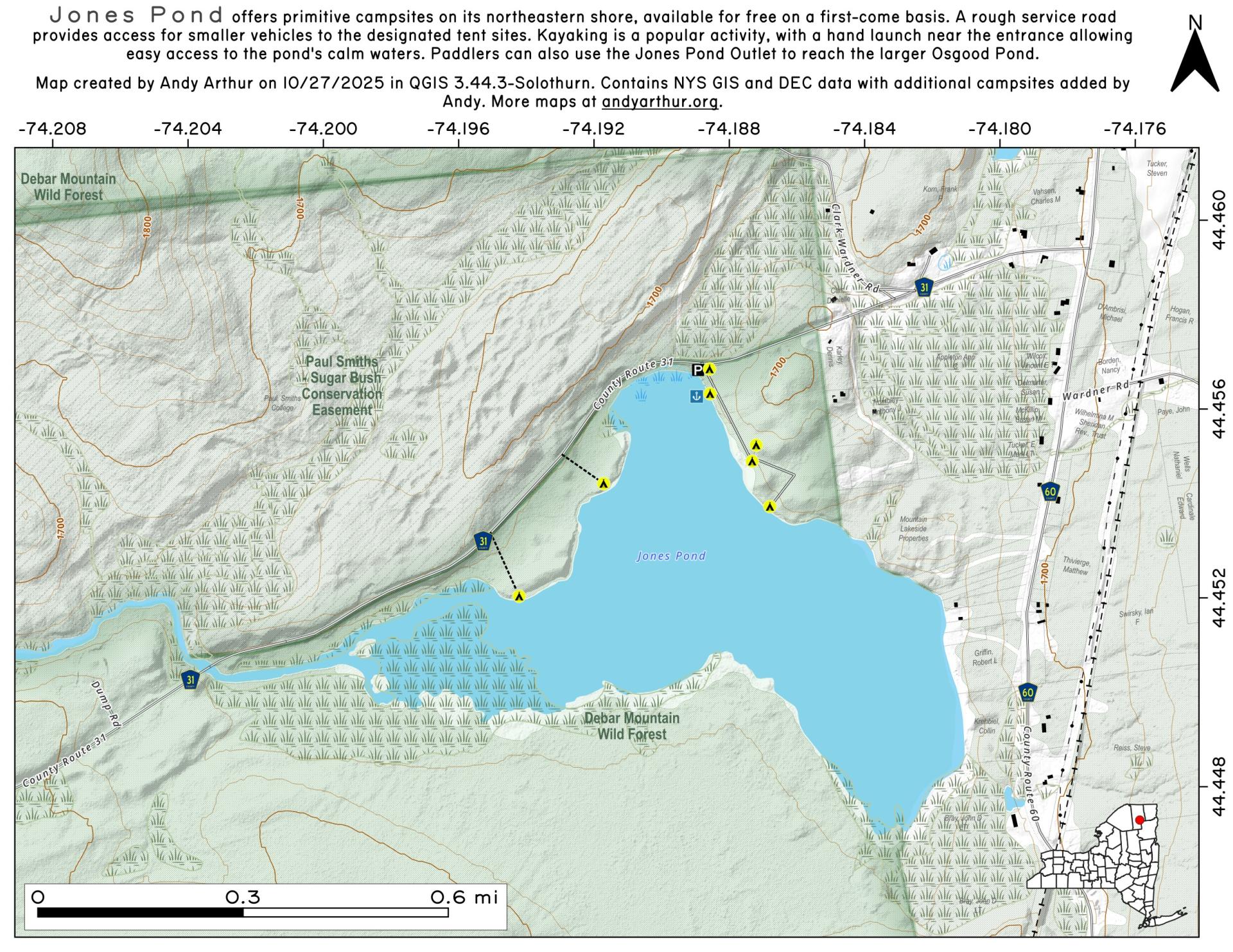 Jones Pond is home to 8 tent and drive-into sites, situated under pine trees. Many of the sites have great views through the trees of Saint Regis Mountain to the west.