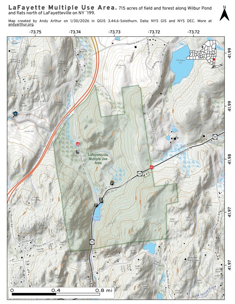 Lafayetteville Multiple Use Area consists of 715 acres in the Town of Milan, Dutchess County. This area has both fields and forests and is regularly stocked with pheasants during hunting season.