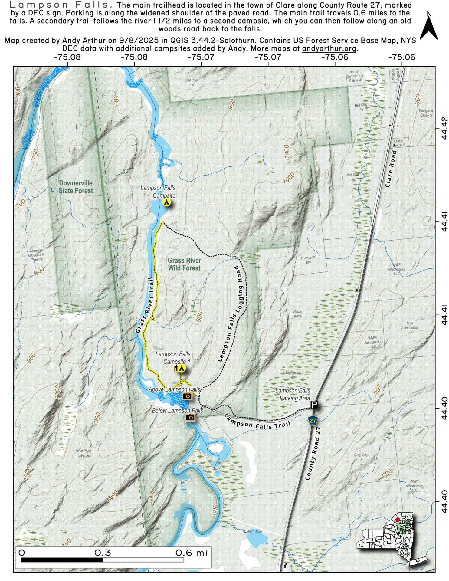 In the Grass River Wild Forest of the northwestern region of Adirondack Park you'll find the overly popular Lampson Falls. The main trailhead is located in the town of Clare along County Route 27, marked by a DEC sign. Parking is along the widened shoulder of the paved road. The main trail travels 0.6 miles to the falls.
