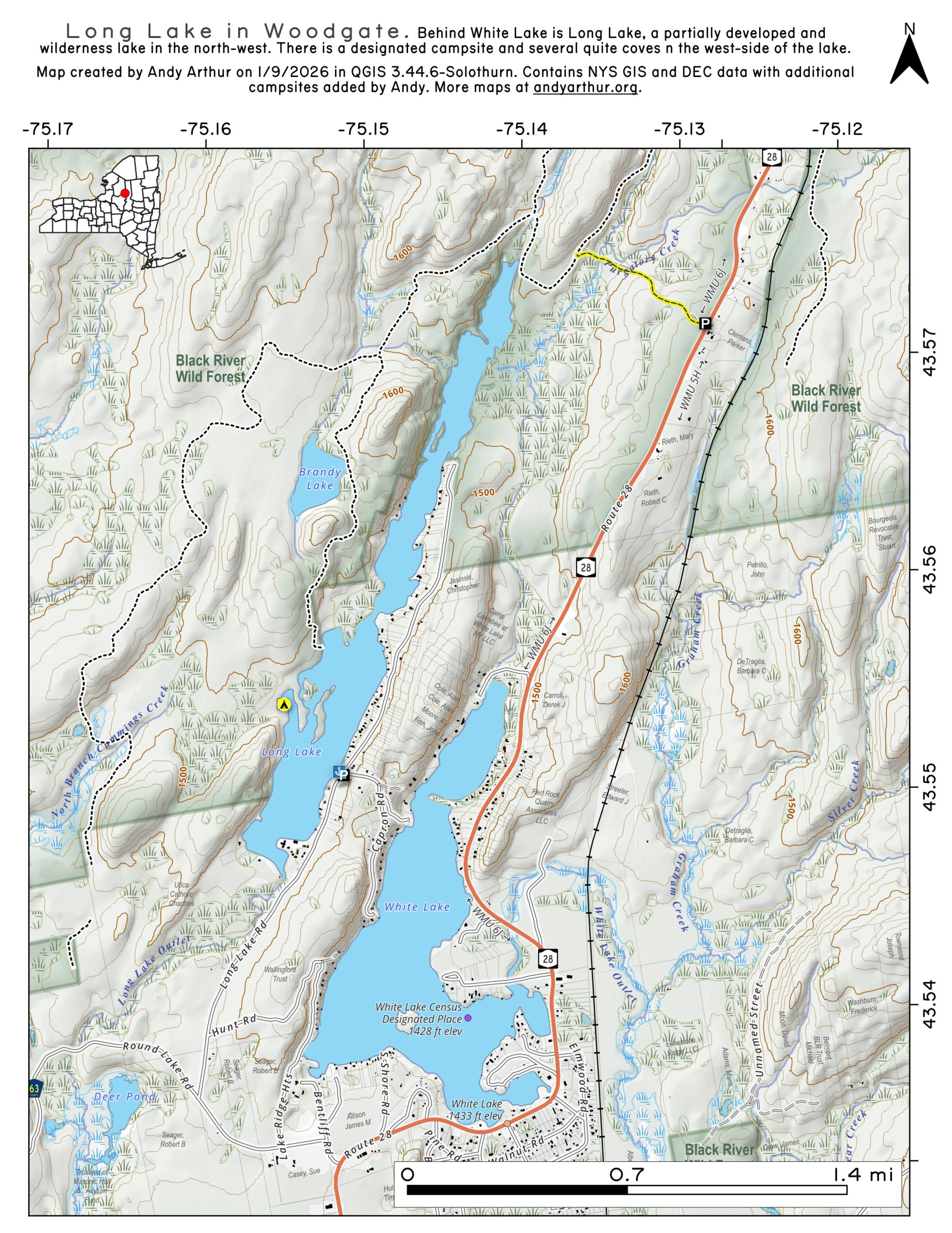 ... shows your location as a blue dot in relationship to campsites, trails, state land. This online map requires cell service, won't work in remote country, so also bring a paper map.