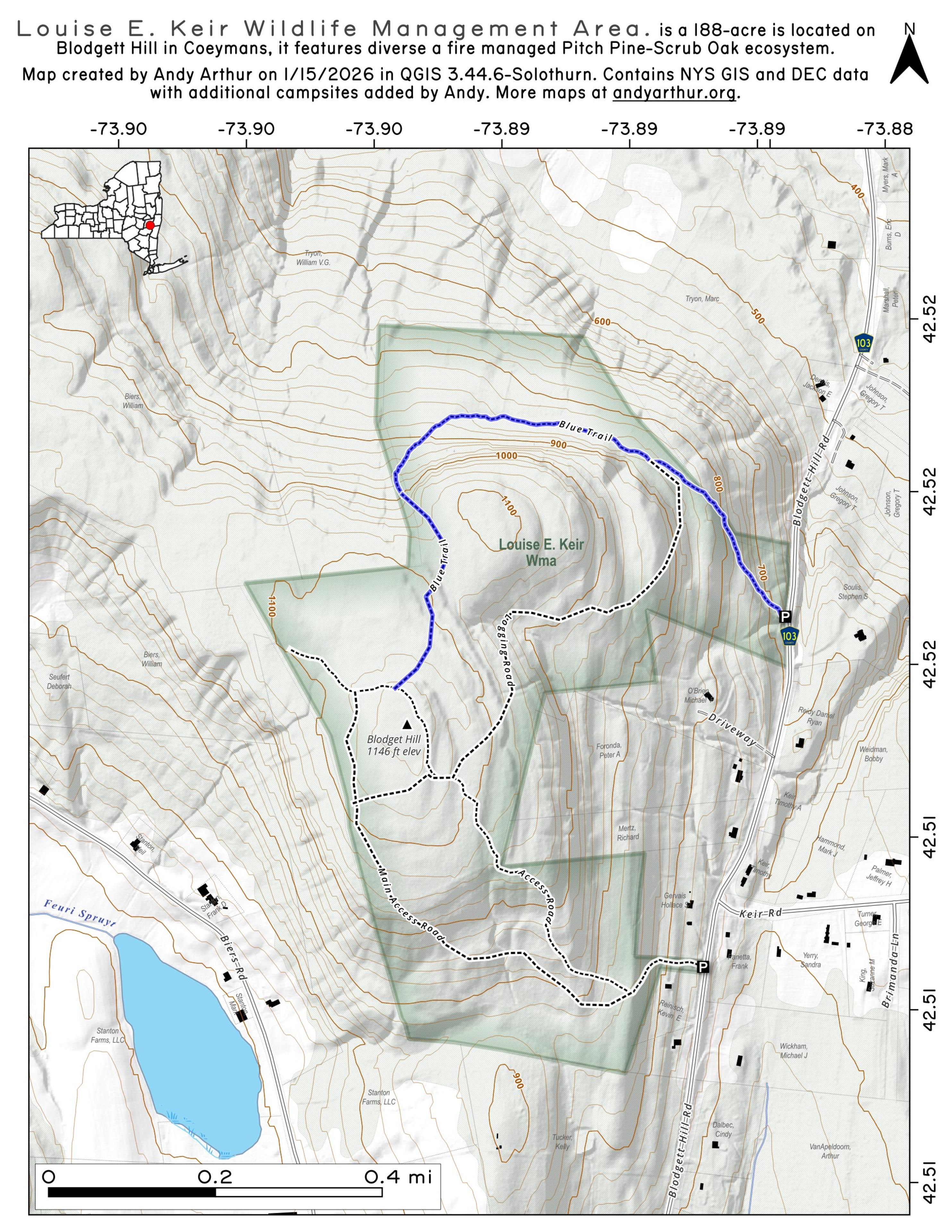 119 acres, upland, parking lot, birdwatching, snowshoeing, hunting and trapping. This WMA is located in the Town of Coeymans. To reach the area from Coeymans Hollow, take County Route 103, north 3 miles to state land.