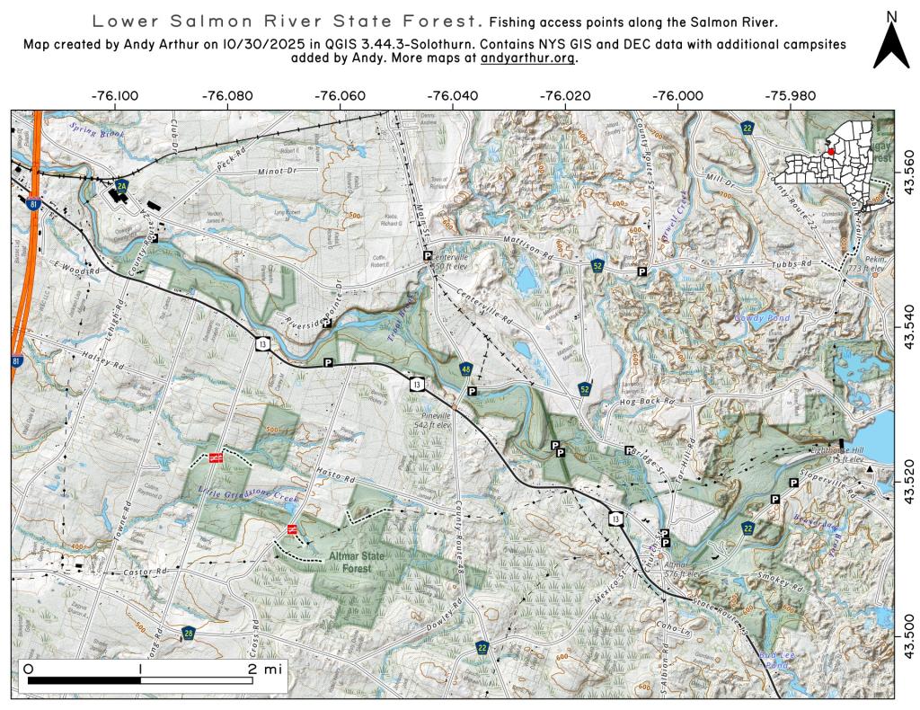 The Salmon River in northern Oswego County is home to one of the most intensively used fisheries for trophy-sized lake run trout and salmon in the nation. DEC recently acquired approximately 1,700 acres of land adjacent to the Lower Salmon River as the result of a settlement agreement with National Grid (formerly Niagara Mohawk).