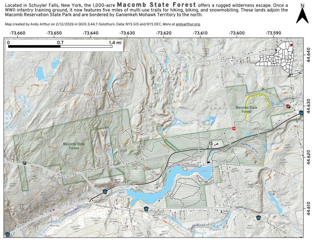 acomb State Forest was once part of a federal reservation where the 26th infantry troops trained during World War II. It is now used for recreation with more than 5 miles of forest roads, multiple use trails, and snowmobile trails. This 1000-acre state forest is located a few miles west of Schuyler Falls, and adjoins the northern boundary of Macomb Reservation State Park.