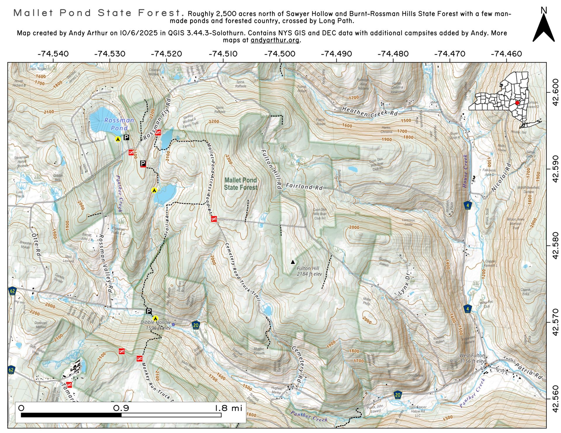 Mallet Pond State Forest is 2,567 acres of state land north of Burnt Rossman State Forest, outside of Fultonham. There are several informal campsites along the lakes that are popular during the summer months. Mallet Pond is most commonly fished for its trout. Special regulations apply. Some decent sized trout have been taken from this small pond. The pond is stocked annually with approximately 250 brown trout and 250 rainbow trout from 8-10" in length. Parking area at gated road off Rosseman Fly Road. Roughly a 0.3 mile walk from parking area to pond.