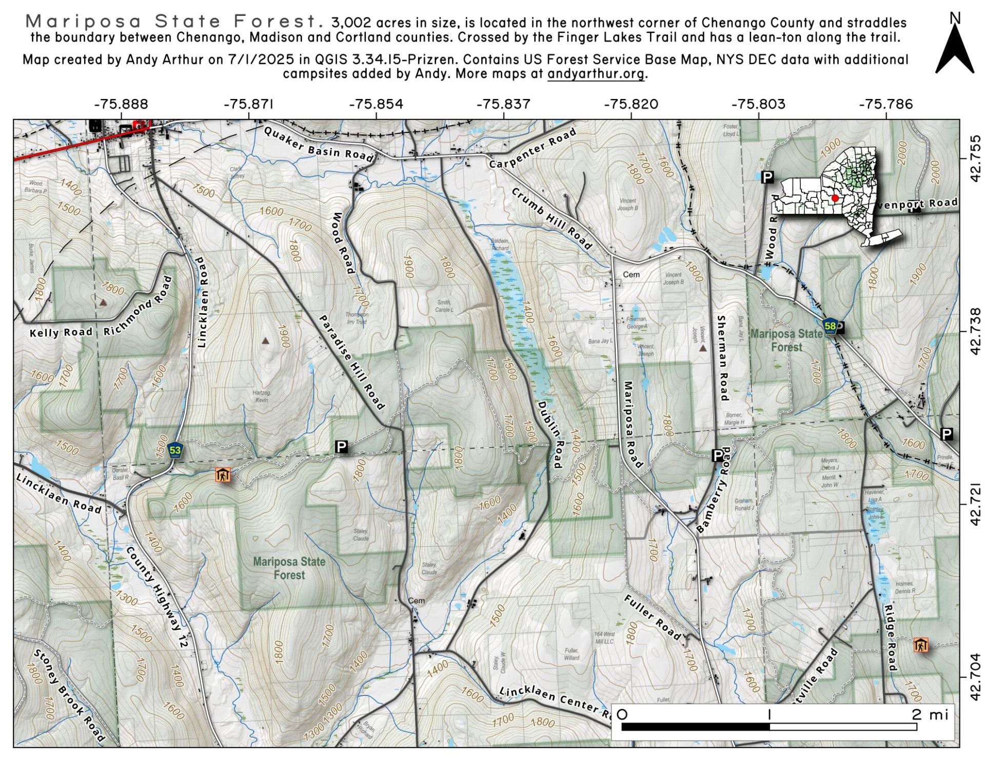 The Mariposa State Forest, 3,002 acres in size, is located in the northwest corner of Chenango County and straddles the boundary between Chenango, Madison and Cortland counties.