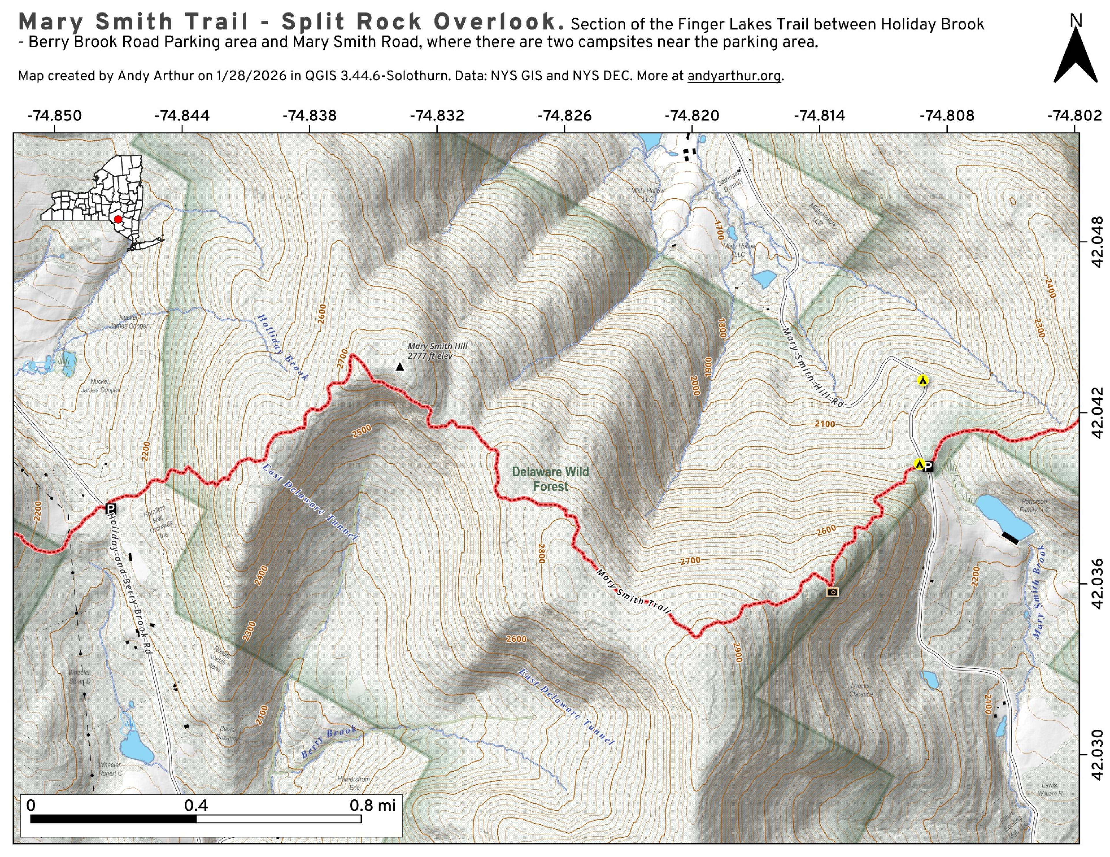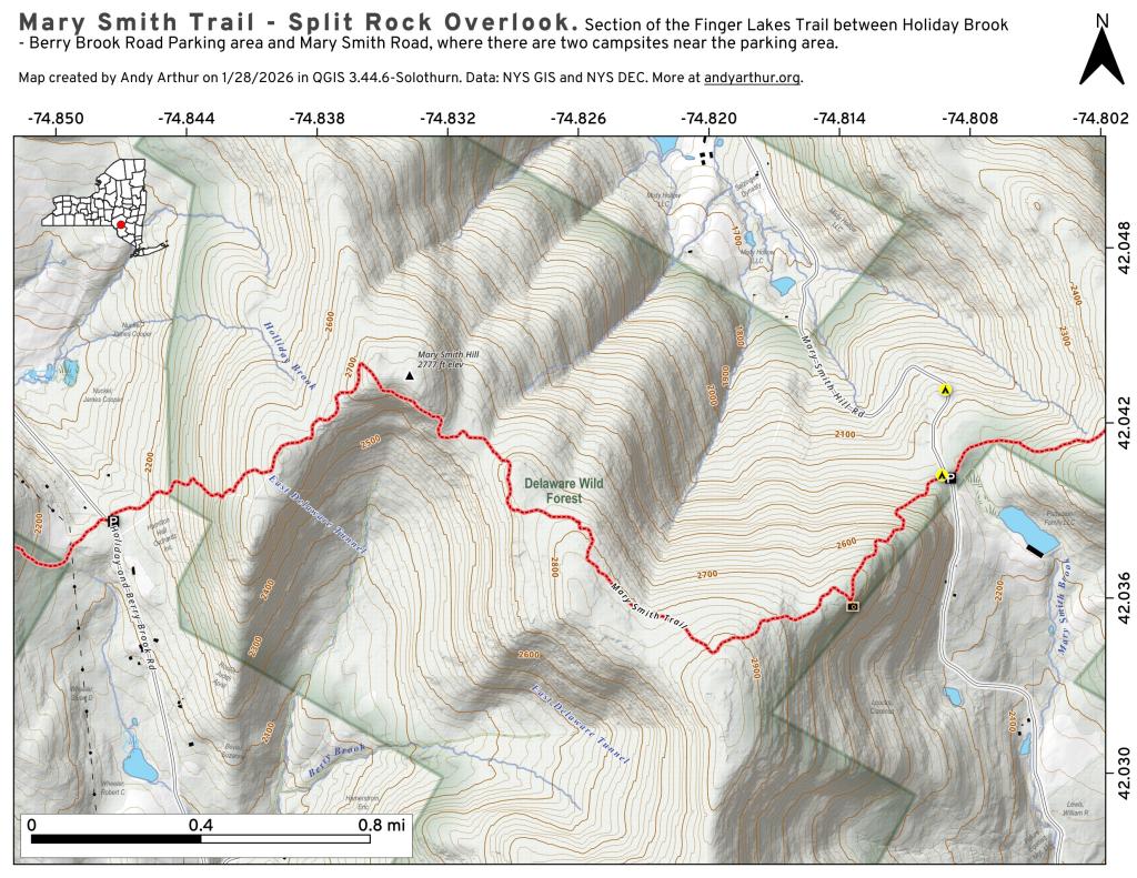 North of Lew Beach in Sullivan County, and in the Town of Andes, south of the Pepacton Reservoir, is a peak crossed by the Mary Smith Trail aka Finger Lakes Trail. It is also home to three of the "rare in the Catskills" Roadside Campsites. It is directly west of Middle Mountain and east of Holiday Brook.