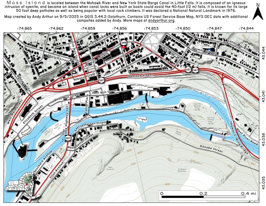 Moss Island is an island in Little Falls, New York, located between the Mohawk River and the New York State Barge Canal. It is composed of an igneous intrusion of syenite, and became an island when canal locks were built so boats could avoid the 40-foot (12 m) falls. It is known for its large 40–50-foot (12–15 m) deep potholes as well as being popular with local rock climbers. It was declared a National Natural Landmark in 1976.